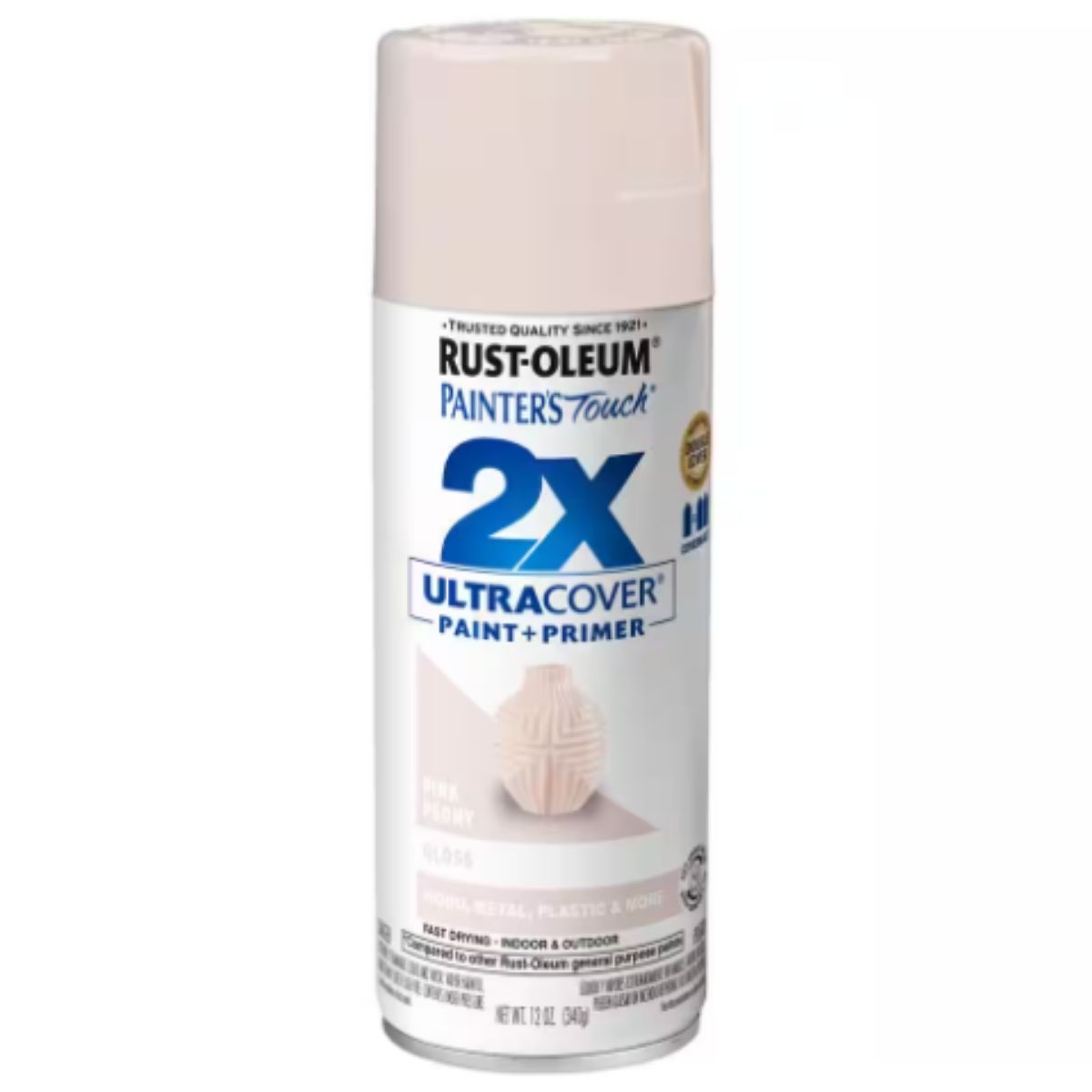 Rust-Oleum Painter's Touch Ultra Cover 2X 12 oz. Gloss Pink Peony General Purpose Spray Paint offers superior coverage and durability with its double cover technology, providing twice the coverage of other Rust-Oleum general purpose paints. Suitable for both interior and exterior use on wood, metal, plastic, and more, this paint is designed to provide long-lasting protection. Its glossy finish adds a fresh shine to surfaces, while the any-angle spray system allows for easy application, even in hard-to-reach areas. Drying to the touch in just 20 minutes, this oil-based formula combines paint and primer in one, covering up to 12 sq. ft. per can. Cleanup is simple with mineral spirits, making it ideal for a variety of DIY and professional projects that require efficient coverage and quick drying times.