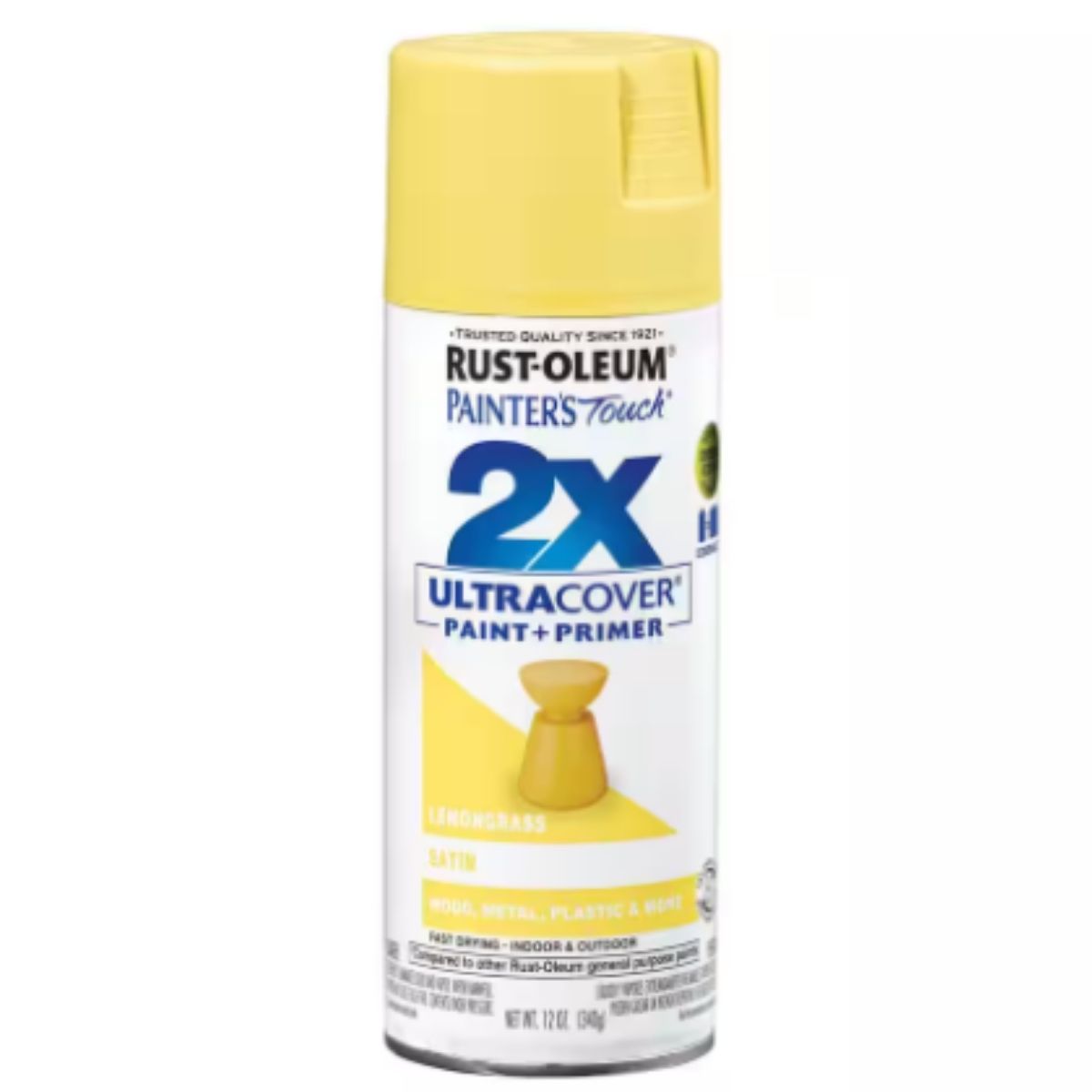 Rust-Oleum Painter's Touch Ultra Cover 2X 12 oz. Satin Lemongrass General Purpose Spray Paint offers advanced double cover technology, providing twice the coverage compared to other Rust-Oleum general purpose paints for faster project completion. Its paint and primer formula ensures ultimate hiding power and durability, suitable for interior or exterior use on various surfaces including wood, metal, and plastic. The satin finish not only enhances surfaces with a fresh shine but also provides long-lasting protection and durability. Featuring an any-angle spray system, it allows spraying in any direction, even upside down, to reach difficult areas easily. This oil-based formula dries to the touch in just 20 minutes, facilitating quick application and turnaround time. Cleanup is convenient with mineral spirits. Combining paint and primer in one, this product is ideal for achieving professional results with ease and efficiency.