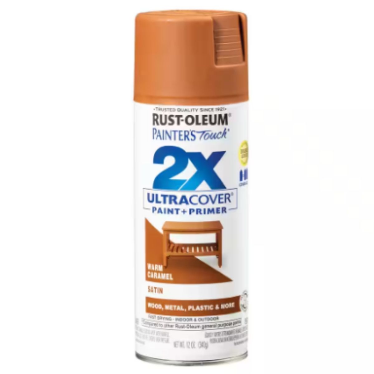 Rust-Oleum Painter's Touch Ultra Cover 2X 12 oz. Satin Warm Caramel General Purpose Spray Paint is designed to provide superior coverage and durability compared to other Rust-Oleum general purpose paints. Featuring double cover technology, this spray paint allows projects to be completed efficiently with its integrated paint and primer formula, ensuring excellent hiding power. Suitable for both interior and exterior applications on wood, metal, plastic, and more, it offers long-lasting protection and durability against various elements. The satin finish not only provides a fresh shine to surfaces but also enhances their appearance with a smooth, low-sheen look. Its any-angle spray system, including the ability to spray upside down, facilitates easy application even in hard-to-reach areas. The comfort spray tip, equipped with a wider finger pad, reduces finger fatigue during extended use. Formulated with an oil-based composition, it dries to the touch in just 20 minutes, enabling quick project turnaround. Cleanup is simple with mineral spirits. Overall, this product combines ease of use, durability, and a high-quality satin finish, making it ideal for a wide range of indoor and outdoor painting projects.