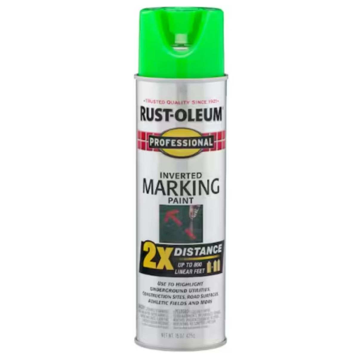 Product Description:The Rust-Oleum Professional 15 oz. 2X Fluorescent Green Marking Spray Paint is designed for marking various surfaces including gravel, soil, grass, concrete, and blacktop. Its vivid fluorescent green color provides short-term resistance against the elements, making it ideal for marking parking lots, floors, athletic fields, and more. This spray paint dries to the touch in as little as 15 minutes, ensuring quick indoor and outdoor applications. Each 15 oz. can create lines up to 800 linear feet, offering twice the coverage distance compared to regular professional marking paints. It features a gloss finish and a no-mess spray-through cap that allows for upside-down use. The paint withstands general weathering and can be easily cleaned up with mineral spirits. Please note that product availability may vary by store.