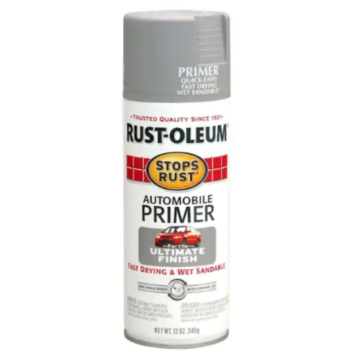 The Rust-Oleum Stops Rust 12 oz. Automotive Primer Spray offers a fast-drying, rust-preventative formula designed for various materials, excluding galvanized metals, with durability suitable for indoor and outdoor use. Its light-gray color is ideal for application under most automotive paints, providing a smooth base. Simply spray on and wait 15 minutes for it to dry before applying a top coat or wet-sanding for an ultra-smooth finish. This primer adheres easily to metal, wood, concrete, and masonry surfaces, drying completely in approximately 120 minutes. Each can covers up to 15 square feet depending on surface porosity. Featuring a comfort tip with a wider finger pad to reduce spraying fatigue and an any-angle spray capability, including upside down, it ensures ease of application in any direction. Renowned for superior rust prevention, it delivers lasting protection and enhances the aesthetic appeal of projects. For more details on Rust-Oleum Stops Rust products or to explore additional options, visit their website, keeping in mind that actual paint colors may differ from digital or printed representations.