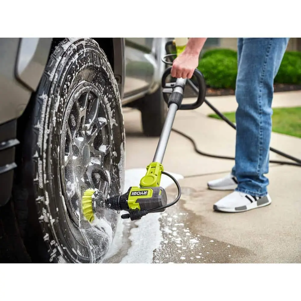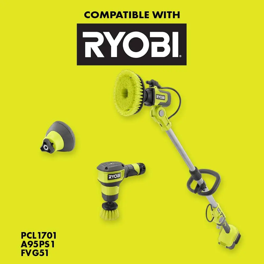 The RYOBI 11-Piece Scrubber Accessory Kit is a versatile cleaning solution with various brush shapes and sizes for cleaning flat and curved surfaces. It features a secure Hex Shank Connection, making it compatible with most drill/drivers and specific RYOBI scrubbers. The kit includes soft, medium, and hard bristle brushes, scour pads, sponges, and a hook and loop backer for quick changes. Ideal for cleaning a wide range of surfaces like glass, tile, fiberglass, brick, and more.