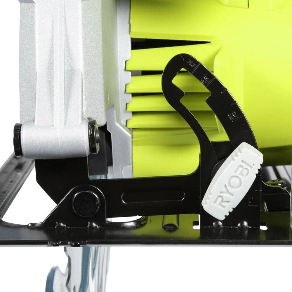 RYOBI's 13 Amp 7-1/4 in. Circular Saw delivers powerful cutting with its 20-tooth steel blade and contoured design for comfort. It offers a 2-7/16 in. depth of cut at 0, 1-7/8 in. at 45, and 1-11/16 in. at 51.5. Features include an on-board wrench storage, adjustable depth of cut, and a cutting scale for accuracy. it comes with a blade, wrench, and operators manual.