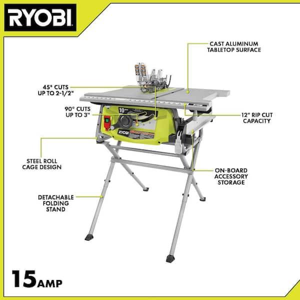 The RYOBI 15 Amp 10 in. Table Saw with Folding Stand is built for tough jobs with its 15 Amp motor and 5000 RPM. It features integrated accessory storage and a durable cast aluminum table top. The foldable stand ensures easy transport and storage. The saw comes with a 10 in. blade, push stick, miter gauge, rip fence, guarding assembly, anti-kickback pawls, and an operator's manual.