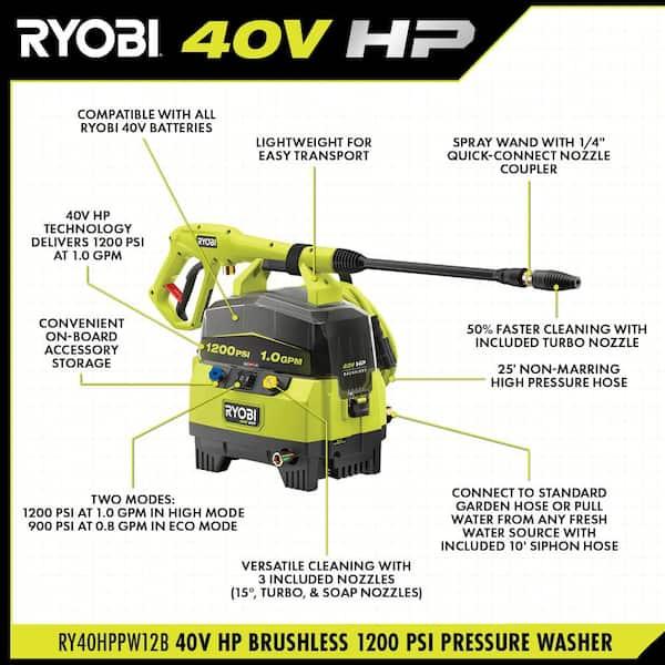 RYOBI 40V Cordless Cold Water Electric Pressure Washer, 1200 PSI, 1.0 GPM (Tool Only)