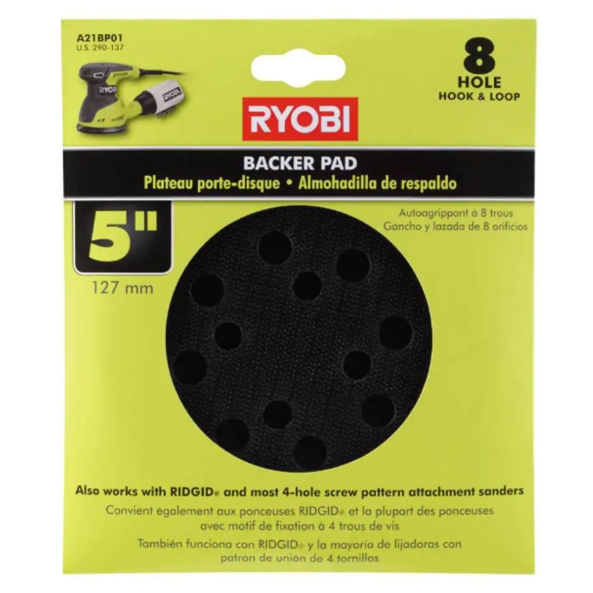 RYOBI presents the 5-inch Backing Pad designed for Orbital Sanders. This backing pad is specifically designed to be compatible with all RYOBI 5-inch random orbit sanders. It is versatile and can be used with any PSA sandpaper type.