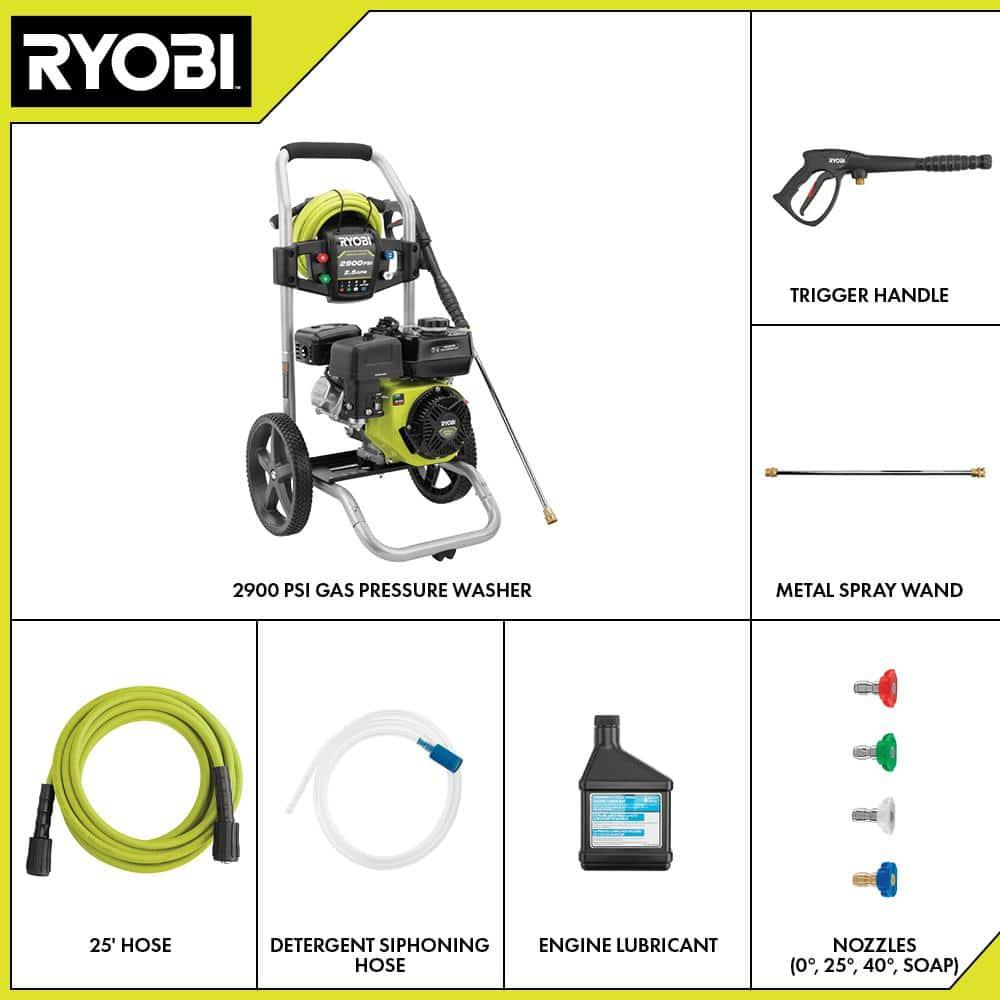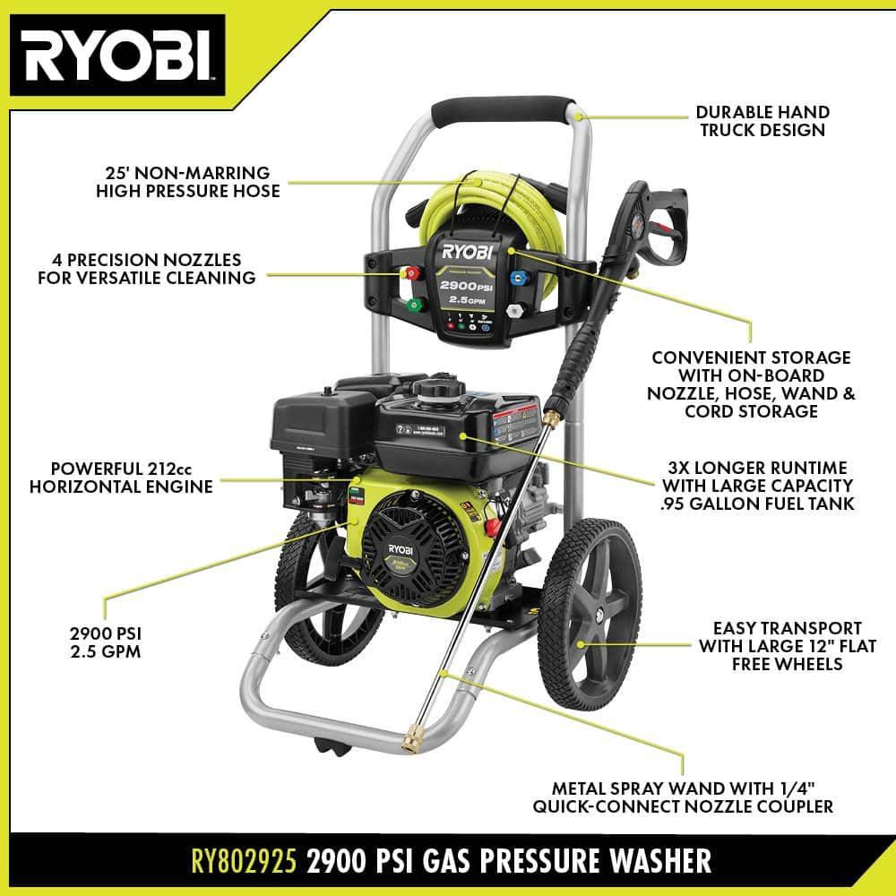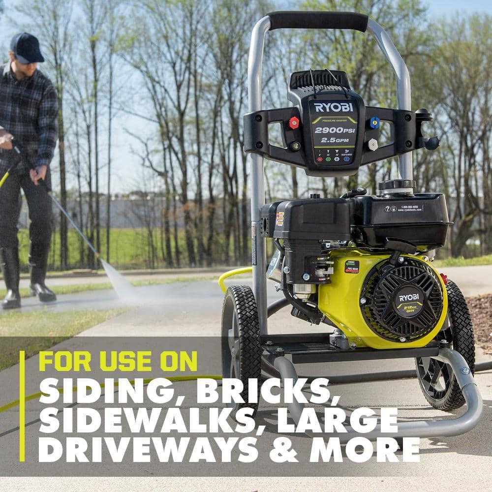The RYOBI 2900 PSI 2.5 GPM Gas Pressure Washer is engineered for heavy-duty cleaning tasks. Its powerful 212 cc horizontal engine excels at removing tough dirt from siding, bricks, sidewalks, and driveways. It includes four nozzles (0, 25, 40, & Soap) for versatile cleaning, and the sturdy metal wand with a quick-connect coupler simplifies nozzle changes. Designed for easy transport, it features a durable hand truck frame and large 12-inch flat-free wheels. The large fuel tank ensures extended runtime, minimizing the need for frequent refueling. A siphon hose allows for efficient detergent application, and the on-board storage keeps nozzles organized when not in use.