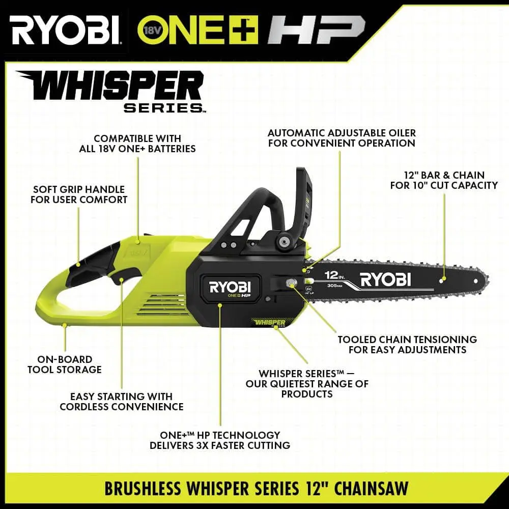 Upgrade your RYOBI 18V ONE+ System with the 18V ONE+ HP Brushless 12" Chainsaw. Powered by ONE+ HP Technology, it combines a brushless motor, advanced electronics, and high-performance lithium technology for 3X faster cutting. Equipped with WHISPER SERIES Technology, this chainsaw is part of RYOBI’s quietest product line, allowing you to cut branches and small trees efficiently and quietly. It can make up to 112 cuts per charge with a 6Ah HIGH PERFORMANCE battery. The 12" bar and chain cuts limbs and logs up to 10" in diameter. Additional features include an automatic oiler, tooled chain tensioning, and onboard tool storage for added convenience. Compatible with the RY12C11 12" Replacement Chain and RYBIO24 Bar & Chain Lubricant. As part of the RYOBI ONE+ system, any 18V ONE+ battery works with any 18V ONE+ tool.