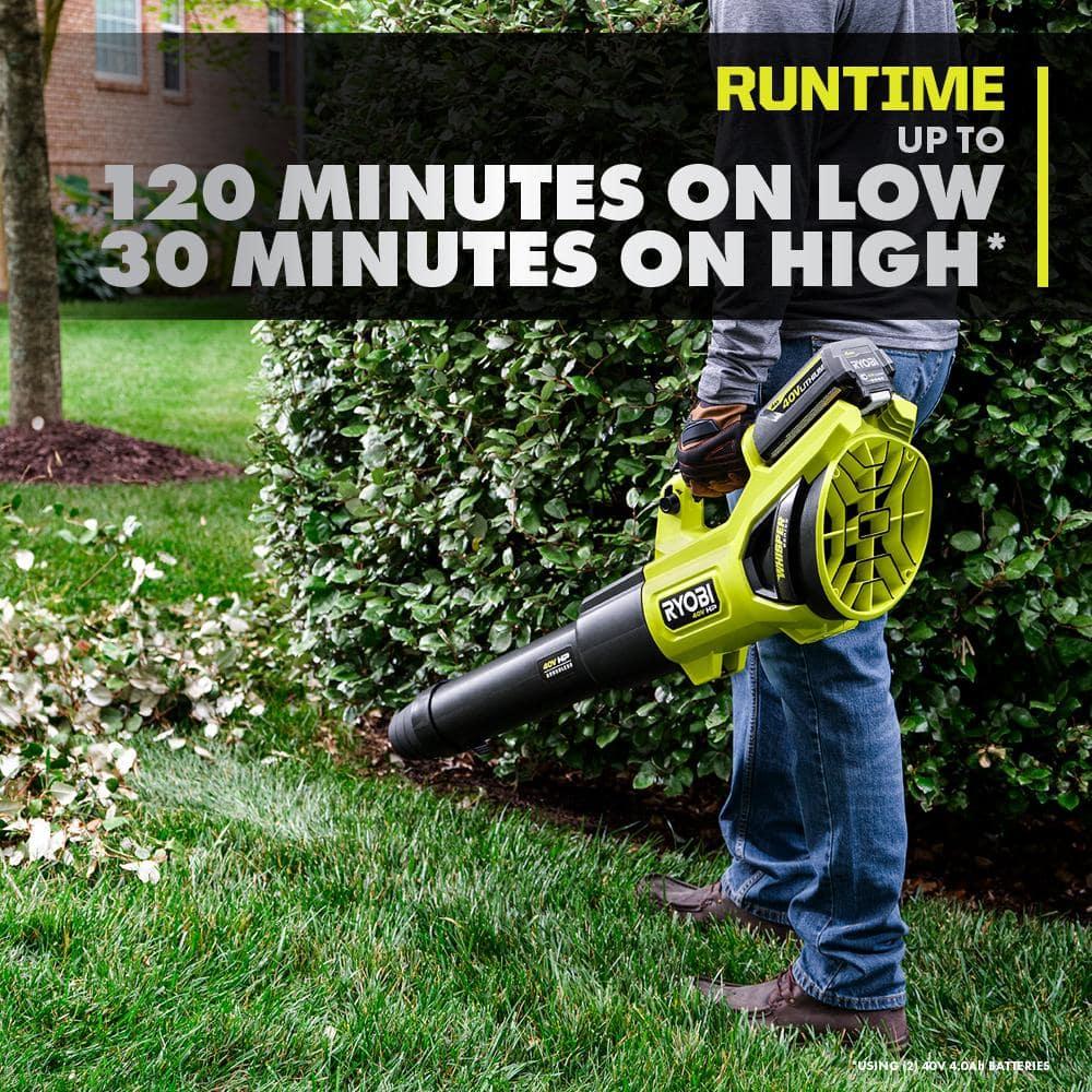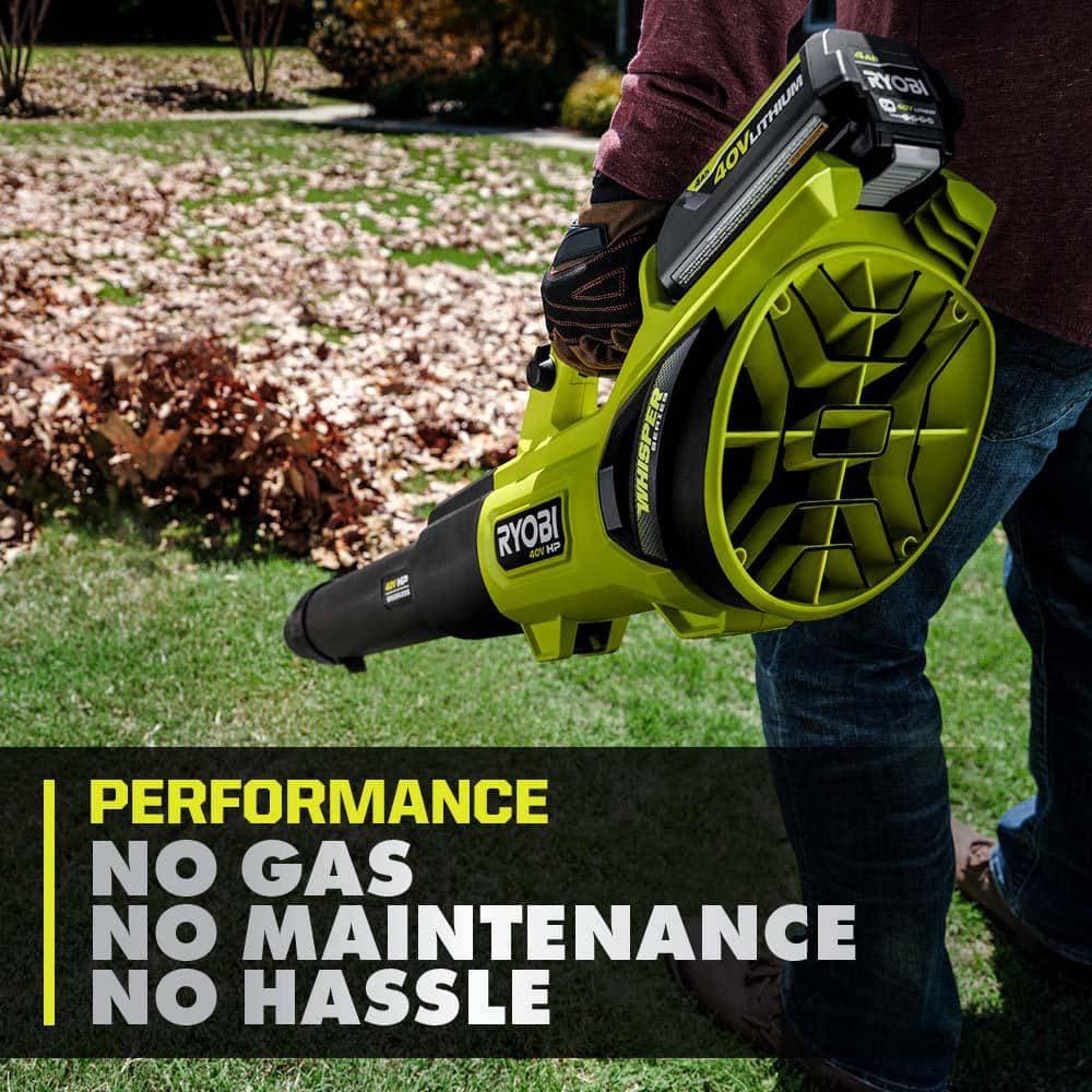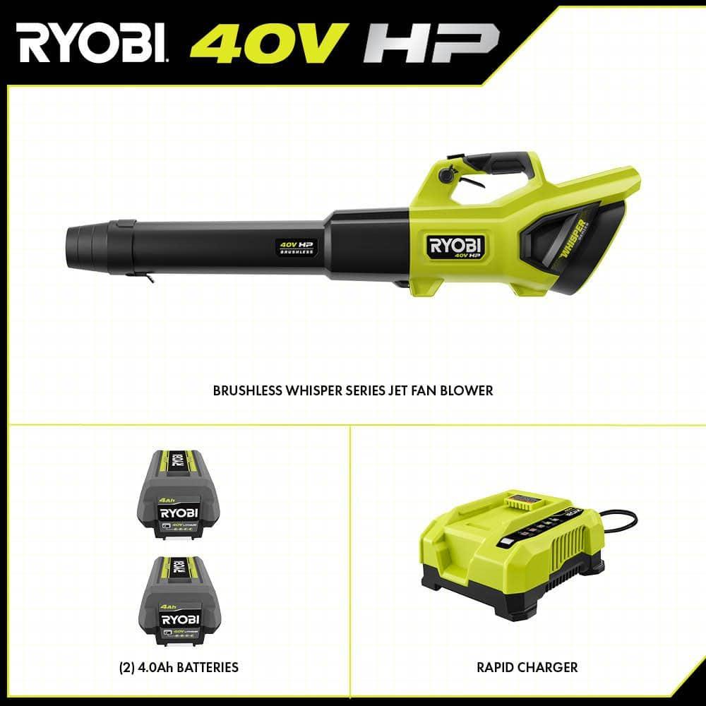 RYOBI 40V HP Cordless Jet Fan Blower brings exceptional power and efficiency to your outdoor cleanup. Powered by 40V HP technology, this blower outperforms a 27cc gas blower without the hassle of gas or maintenance. Delivering an impressive 730 CFM and 190 MPH, it effortlessly handles heavy lawn debris and wet leaves. The blower is equipped with 40V HP technology that combines a brushless motor, advanced electronics, and lithium technology, providing up to 120 minutes of runtime with the included (2) 40V 4Ah batteries. Its Whisper Series design features noise-dampening foam and a uniquely positioned fan, making it 86% quieter than gas and other cordless blowers. Control airflow with precision using the variable speed trigger and turbo button. The blower also includes two customizable speed tips for enhanced blowing power. Part of the RYOBI 40V System, it is compatible with any 40V battery in the lineup. This kit includes the RY404010 40V Jet Fan Blower, (2) OP40404 40V 4Ah Lithium Batteries, OP406 40V Rapid Charger, Blower Tube, (2) Speed Tips, and Operators Manuals.
