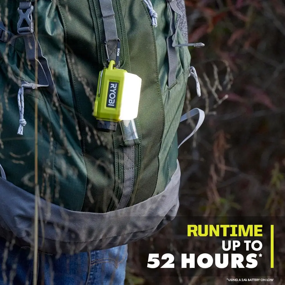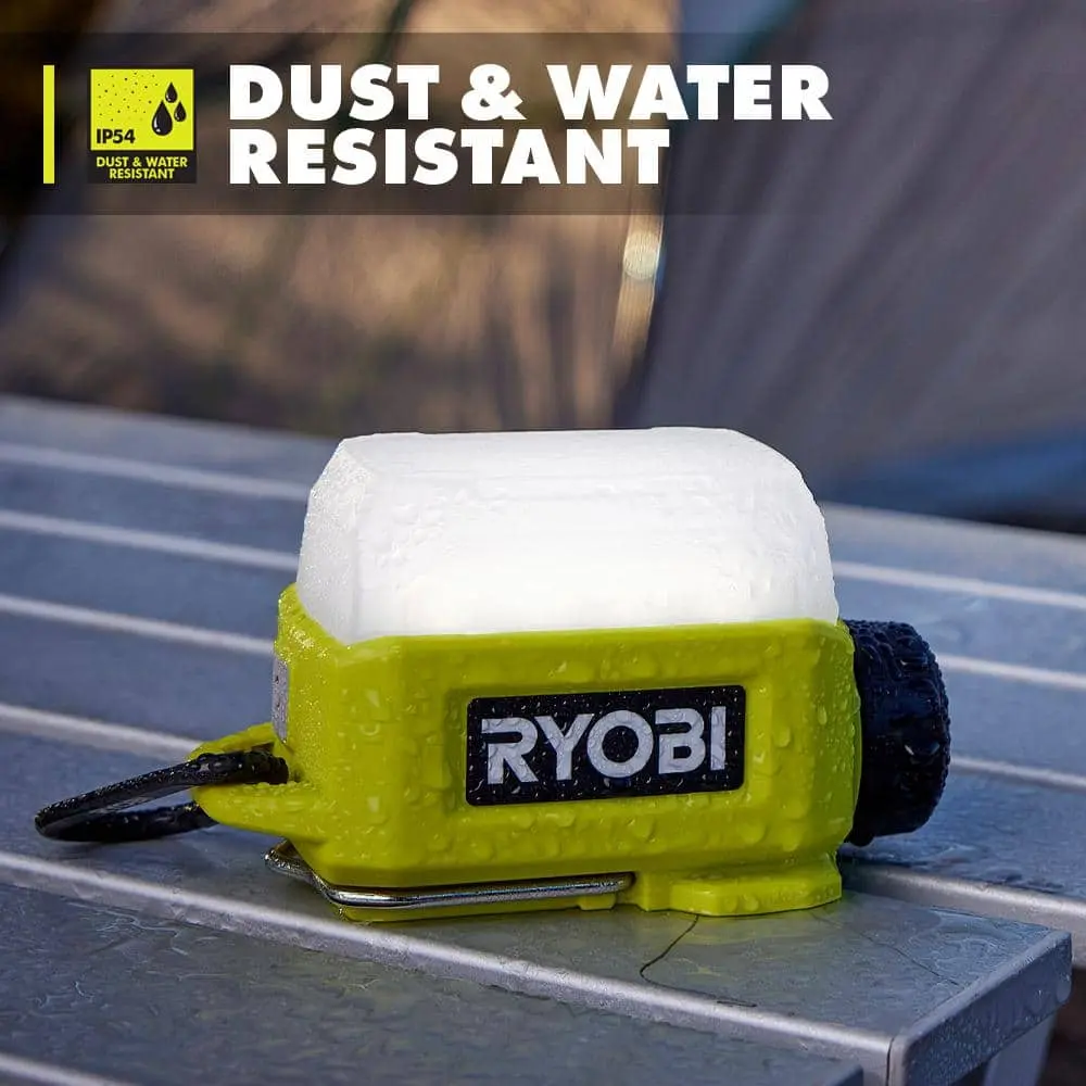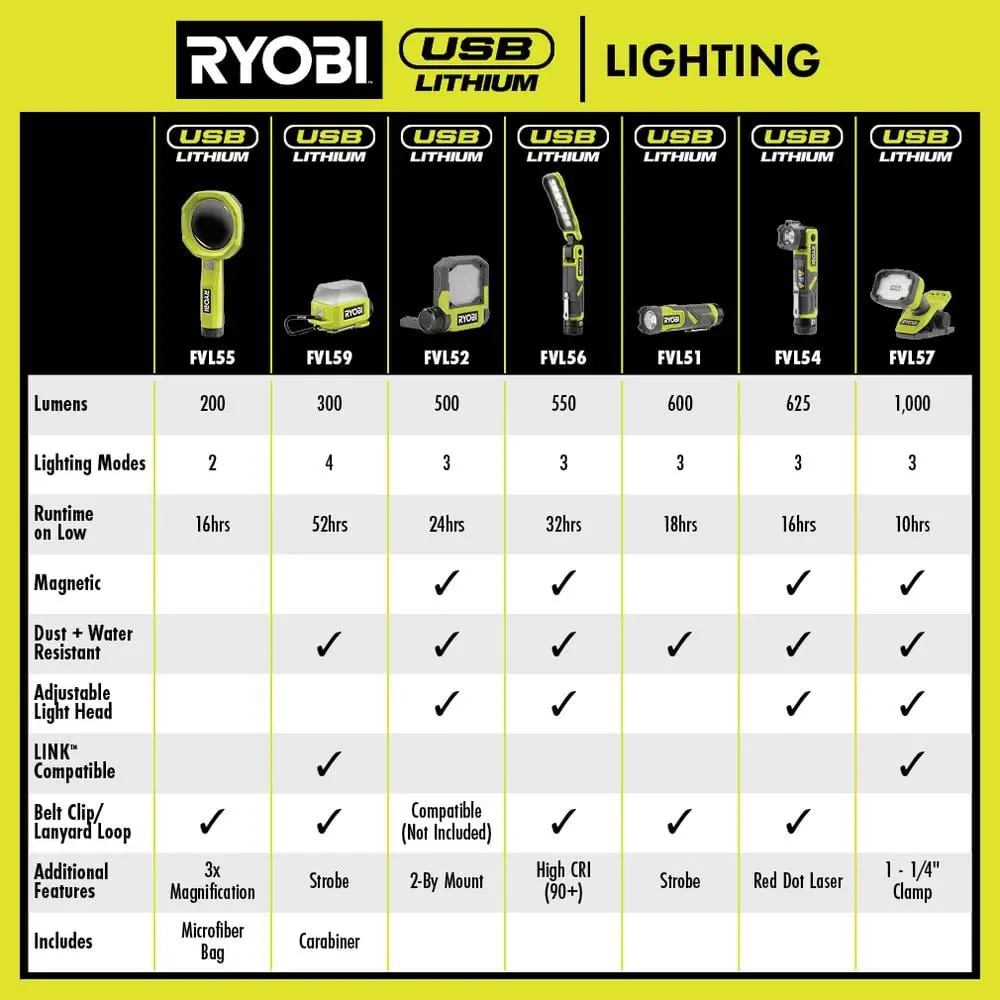 The RYOBI USB Lithium LED Compact Area Light Kit offers powerful illumination in a compact, durable design. This area light delivers up to 300 Lumens of light and provides hands-free operation with a folding metal hook, included carabiner, and compatibility with the RYOBI LINK Wall Storage system. With a long-lasting 52 hours of runtime on low with the included USB Lithium 2Ah Battery, this light is perfect for emergency situations. It features an IP54 dust and water resistance rating, ensuring reliable performance in tough conditions. The included battery has a USB-C port to charge mobile devices, and an LED fuel gauge to show the battery level with a simple press. Additionally, an LED indicator on the light shows green when charged and red when the battery is low. As part of the RYOBI USB Lithium System, this light offers a portable, rechargeable solution for all your lighting needs. The kit includes the FVL59 LED Compact Area Light, USB Lithium 2Ah Battery, USB Cable, and Operator's Manual.