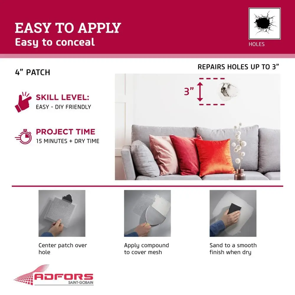 Saint-Gobain ADFORS FibaTape Perfect Finish 4 in. x 4 in. Self-Adhesive Wall Repair Patch is self-adhesive, eliminating the need for additional adhesives and sticking directly to the wall for hassle-free application. It offers quick and easy application, simplifying your wall repairs with minimal effort. The patch is durable, ensuring long-lasting repairs on both walls and ceilings. Designed to provide a perfect finish, it helps create a smooth, seamless surface that’s ready for painting. Its compact size of 4 in. x 4 in. makes it ideal for repairing small holes and cracks