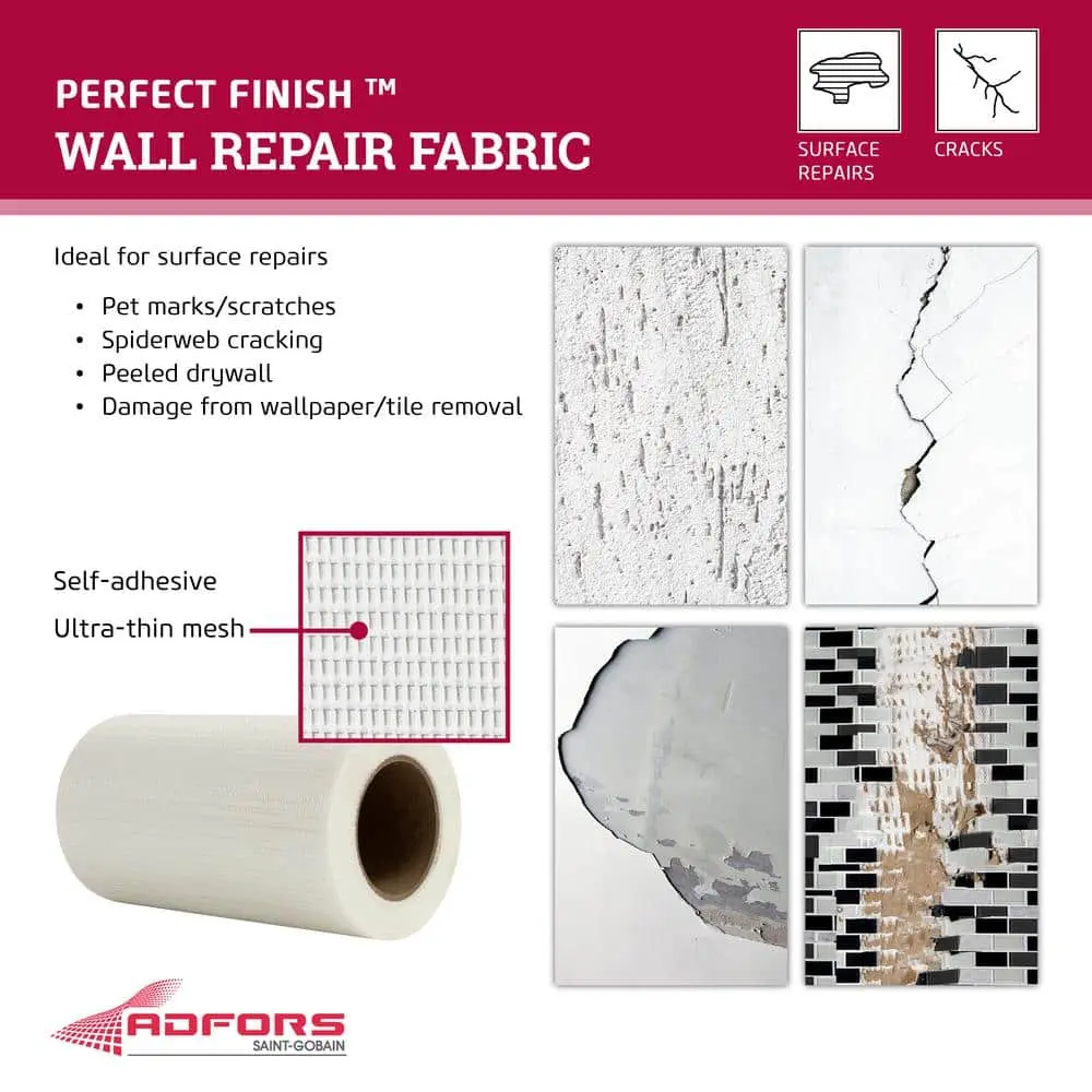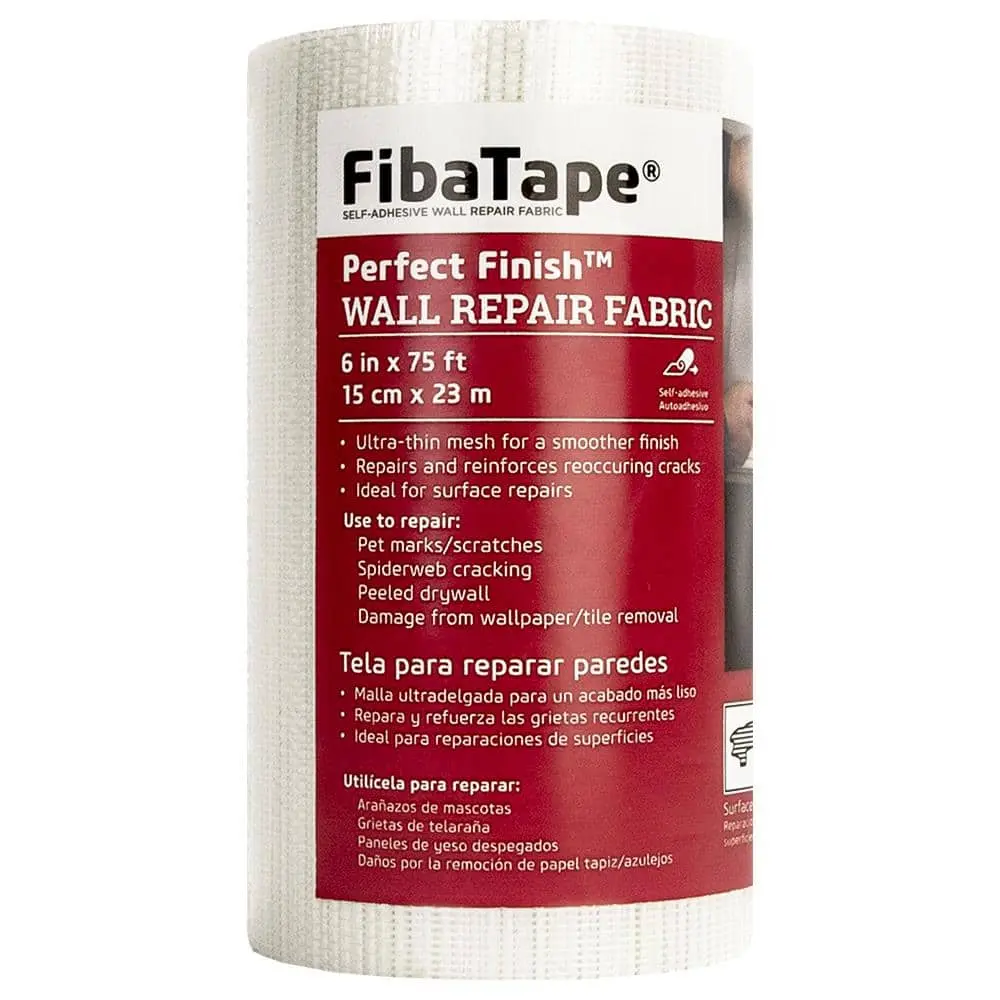 Saint-Gobain ADFORS FibaTape Perfect Finish 6 in. x 75 ft. Self-Adhesive Wall Repair Fabric features a self-adhesive design, allowing for easy application without the need for pre-pasting. Its ultra-thin design ensures a smooth, seamless finish with minimal buildup. Made from strong and durable reinforced fiberglass mesh, it resists cracking and provides long-lasting repairs. The easy-to-use material cuts effortlessly, making wall repairs quick and simple. Versatile for drywall seams, cracks, and patching projects, this tape is also mold and mildew resistant, helping prevent moisture damage for enhanced durability.