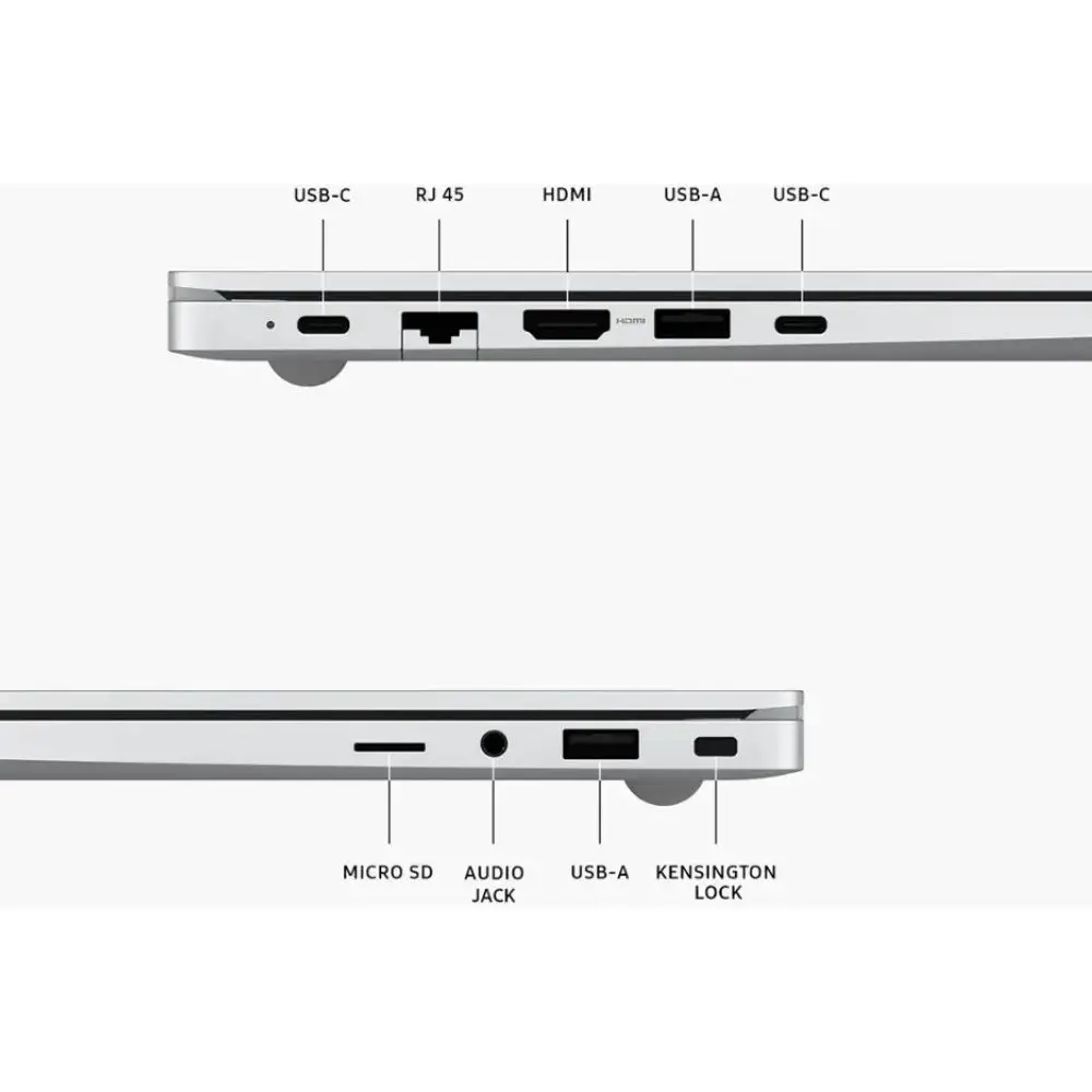 For connectivity, it includes Wi-Fi, Bluetooth, 2 USB-A 3.2 ports, 2 USB-C ports, HDMI output, and a headphone jack. It runs on Windows 11 Home with built-in support for Bixby, Amazon Alexa, and Cortana. Security features include a fingerprint reader and Kensington lock slot. Other highlights include Dolby Atmos stereo speakers, a 720p front-facing camera, a backlit keyboard, and a microSD card slot. With a 15-hour battery life and USB-C charging (45W power supply), this lightweight aluminum laptop is built for portability and efficiency.
