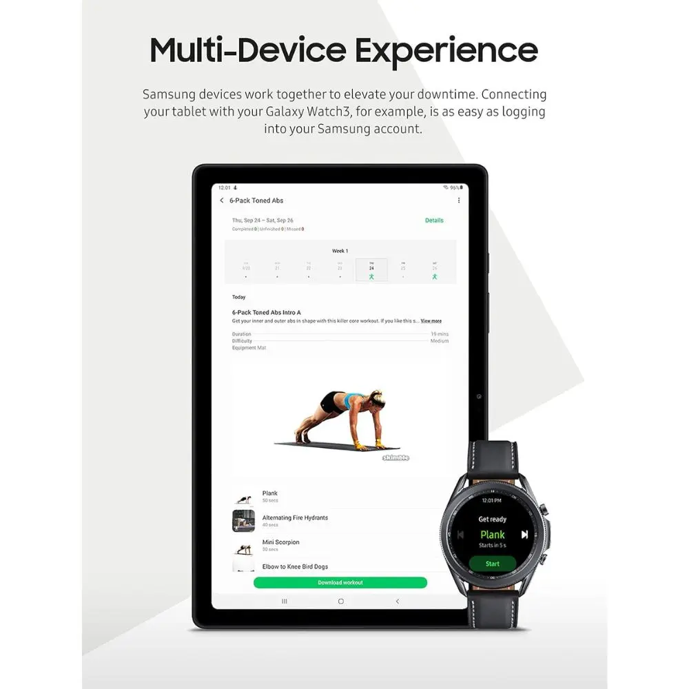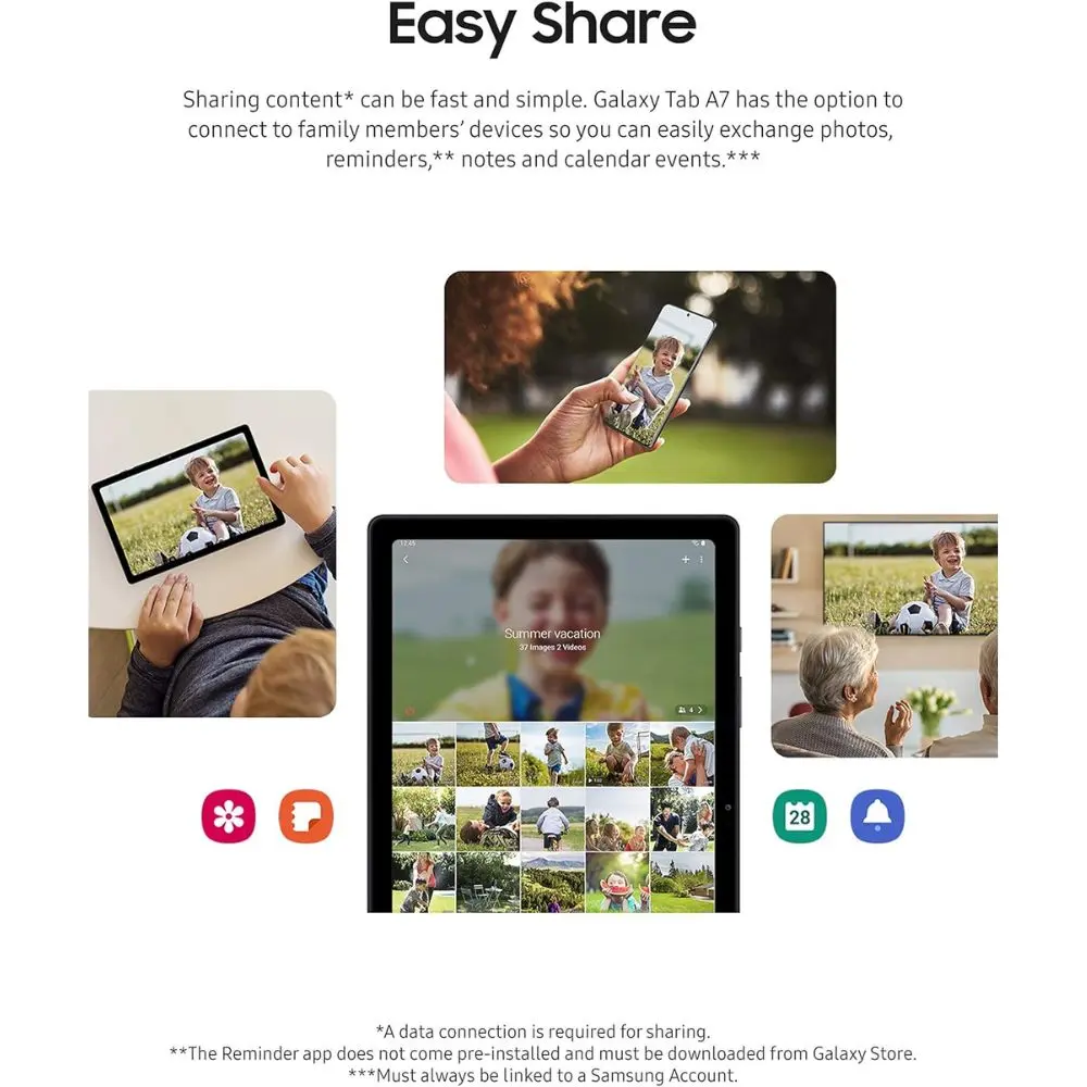 The Galaxy Tab A7 combines a sleek, lightweight design with an immersive entertainment experience. Its ultra-wide screen brings movies and shows to life, while Dolby Atmos surround sound speakers create an engaging audio experience. The landscape-oriented, front-facing camera enhances video calls, helping you feel closer to family and friends. Equipped with a fast processor, long-lasting battery, and ample built-in storage, the Tab A7 allows you to enjoy more streaming, browsing, music, and photos. Plus, it's compatible with multiple voltages, ranging from 100-240V.