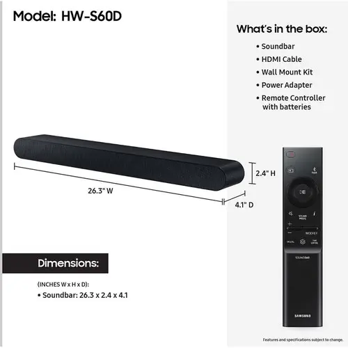 he Samsung HW-S60D soundbar is designed to enhance your home audio experience with its 5.0-channel configuration, providing rich, immersive sound for both movies and music. It supports advanced audio formats such as Dolby Atmos, DTS Virtual