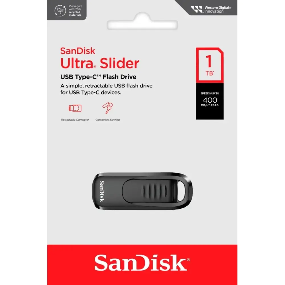The SanDisk Ultra Slider USB Type-C Flash Drive offers fast, effortless storage for your USB Type-C devices. Whether it's vacation videos or work presentations, you can easily transfer and access your files with read speeds of up to 400MB/s (for 128GB - 1TB models). Designed for convenience, it includes a keyring for easy attachment to your keys or bag, and a retractable connector that helps prevent wear and tear. With its sleek design, high-speed performance, and portability, the SanDisk Ultra Slider USB Type-C is the perfect accessory for your mobile lifestyle.