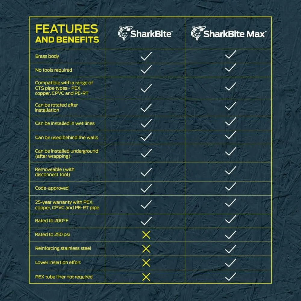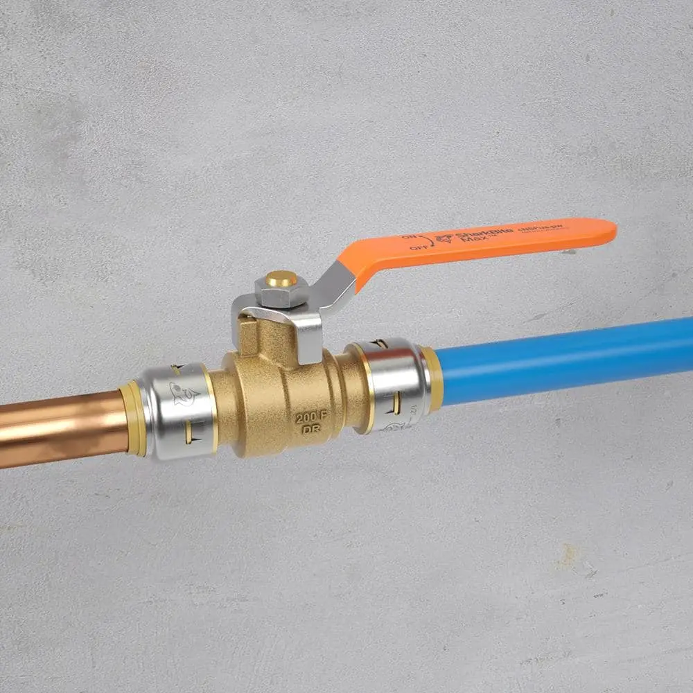 SharkBite Max push-to-connect ball valves offer the fastest and easiest installation for new or replacement water shut-off valves. With a newly designed stainless steel collet retainer, these valves deliver increased strength, durability, and a 250 psi pressure rating. Unlike traditional fittings, SharkBite Max valves don’t require a PEX tube liner and are easier to install with less force. The single lever quarter-turn handle provides quick control over water flow, even in tight spaces. No soldering, clamps, unions, glue, or special tools are needed. Once the pipe is inserted, stainless steel teeth securely grip the pipe, and the O-ring creates a watertight seal. The valve can be rotated after installation for quick adjustments, and removal is simple with a disconnect tool, allowing for easy reuse.