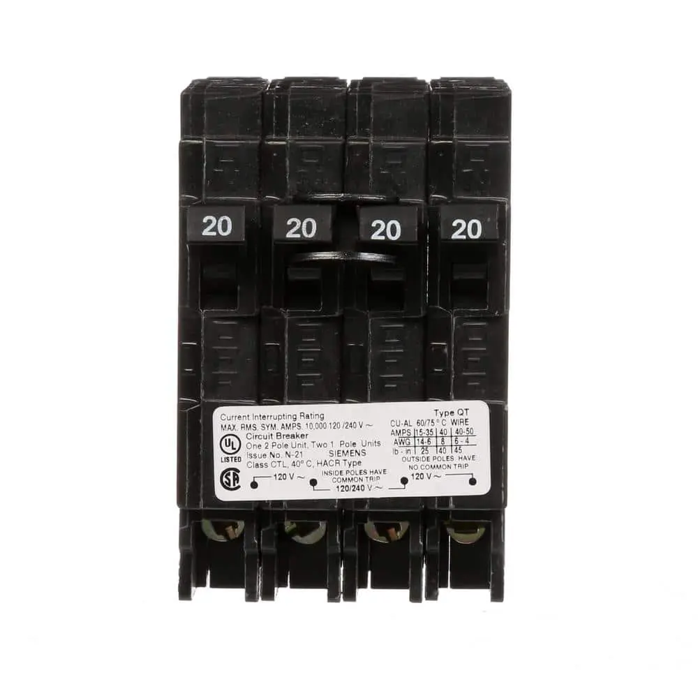 Siemens Triplex Type QT breakers feature a 1/2 in. frame per pole and are designed for use in Siemens panels that accommodate CTL-type QT breakers. These breakers provide overload and short-circuit protection to safeguard your home's wiring from damage caused by excessive electrical currents. The Triplex Circuit Breaker includes an inner 2-pole and two outer 1-pole breakers. They are plug-in style, with load terminals included. Rated for 120/240-Volt AC and designed for a maximum ambient temperature of 40°C, these breakers offer a standard interrupting rating of 10k AIC.