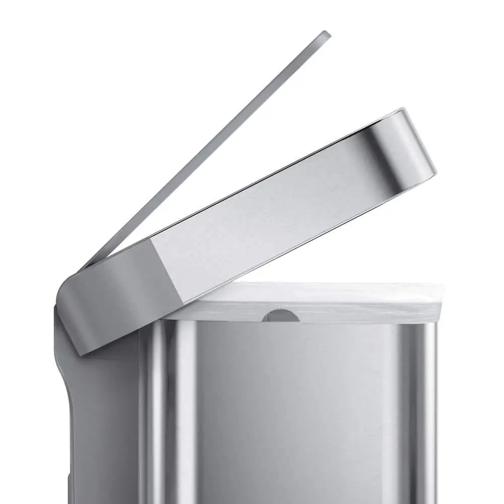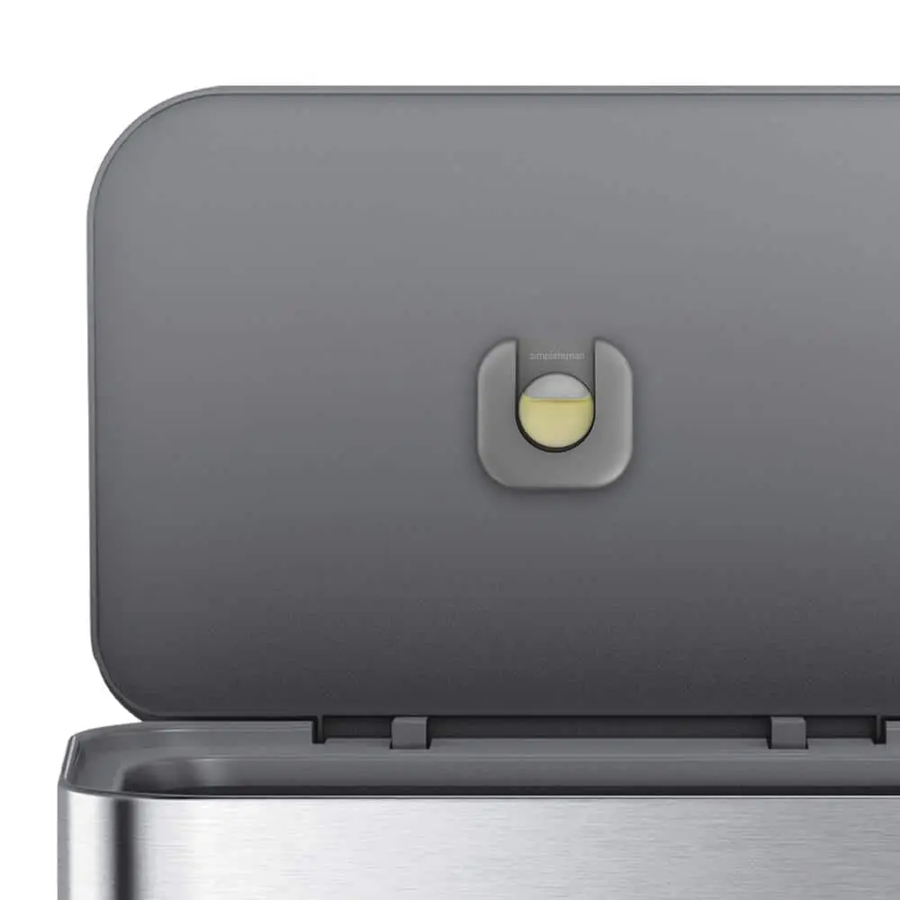 The simplehuman stainless steel rectangular step can features an innovative 'liner pocket' that stores and dispenses liners from inside the can, making liner changes quicker and easier. The stainless steel liner rim securely grips the liner, keeping it concealed. With no inner bucket, the design offers more space for trash. The durable plastic pedal is built to last, while the patented Lid Shox technology ensures a smooth, silent close of the dent-proof plastic lid. Code M liner refill packs fit perfectly in the liner pocket for easy storage. Additionally, the can includes an all-natural Odorsorb pod that discreetly fits under the lid to neutralize odors for up to 45 days.