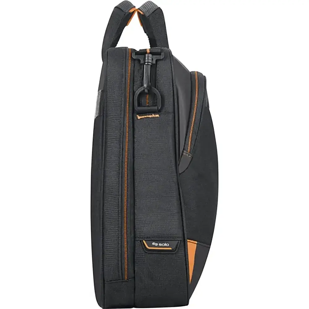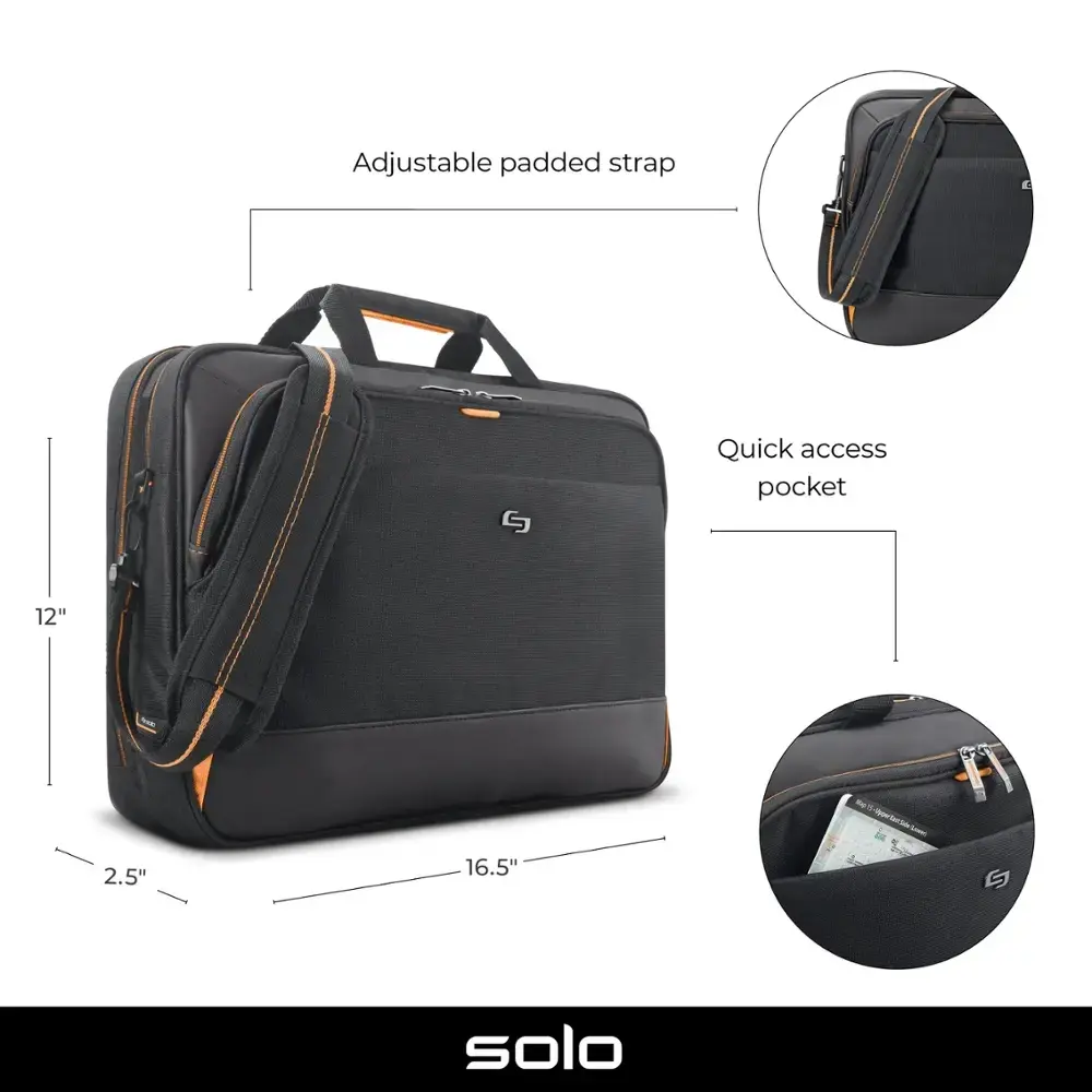The Solo New York Focus Briefcase is designed with three pockets to safely store and protect laptops up to 17.3", as well as ultrabooks ranging from 11" to 13" and 14" to 15.6". It provides multiple carrying options, including handles, a shoulder strap, and a ride-along strap.