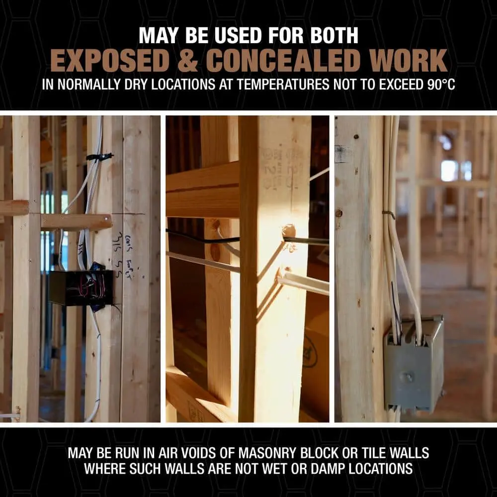 Southwire Romex Brand SIMpull NM-B (nonmetallic-sheathed) cable is designed for both exposed and concealed applications in dry locations, with a temperature limit of 90°C (ampacity is limited to 60°C conductors). Primarily used in residential wiring as branch circuits for outlets, switches, and other loads, it can be routed through air voids in masonry block or tile walls, provided these walls are not damp. The cable is rated for 600 volts.