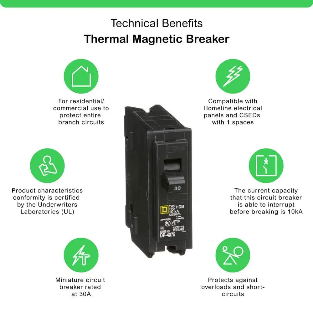 The Square D by Schneider Electric Homeline 30 Amp One-Pole Circuit Breaker is designed to protect your electrical system from overloads and short circuits. It is compatible with Homeline load centers and CSED devices. This ANSI-certified, UL-listed breaker is rated for 120/240 VAC and 10,000 AIR. Known for Square D's reliable quality, Homeline circuit breakers offer excellent value while delivering top-tier performance. Exclusively designed for the residential market, Homeline products provide everything needed to efficiently distribute electricity throughout your home.