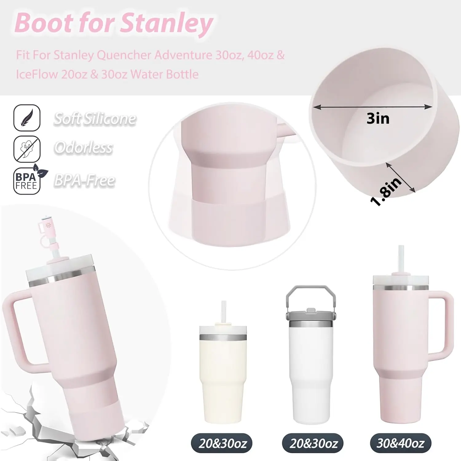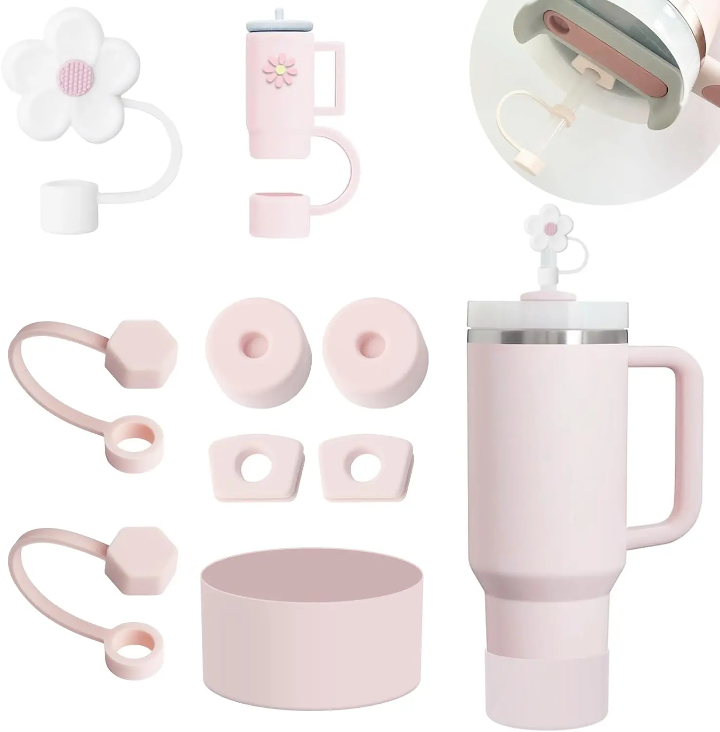 Package Includes: This Stanley cup accessories set features 2 straw cover caps, 2 square spill stoppers, 2 round lid leak stoppers, 1 flower straw topper, 1 silicone boot sleeve, all designed for Stanley Adventure Quencher (40 oz) and IceFlow (20 oz, 30 oz) tumblers. The straw covers fit 9-10 mm straws.Practical Design: The lid spill stoppers feature a 360 anti-leak design, while the silicone boot protects against scratches and reduces noise. Straw covers provide an airtight seal, keeping your drinks safe from dust and spills.High-Quality Silicone: Made from food-grade silicone, these accessories are durable, odorless, and reusable. Easy to clean by hand or in the dishwasher, the cute flower straw topper adds a fun touch.Wide Compatibility: Compatible with Stanley Quencher 1.0/H2.0 and Simple Modern tumblers (40 oz, 30 oz). The 10 mm straw cap fits Stanley's original straw, and the silicone boot fits cup bases with a diameter of 2.75-2.95".Perfect for Outdoor Use: Lightweight and portable, this accessory kit is ideal for various activities like camping, hiking, and road trips, making it a must-have for Stanley cup users of all ages.