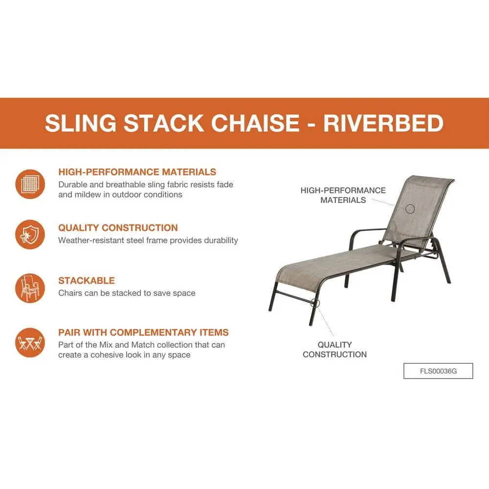 An ideal addition to your outdoor space, the Hampton Bay Mix and Match Sling Outdoor Chaise Lounge offers comfortable seating for your sunroom, patio, or deck. Featuring a dark brown frame and a taupe sling seat, this lounge chair complements various exterior decor styles, transforming any outdoor area into a relaxing retreat. The stackable design is built with a durable steel frame, a powder-coated finish, and weather-resistant sling fabric for long-lasting use. No assembly is required for easy setup.