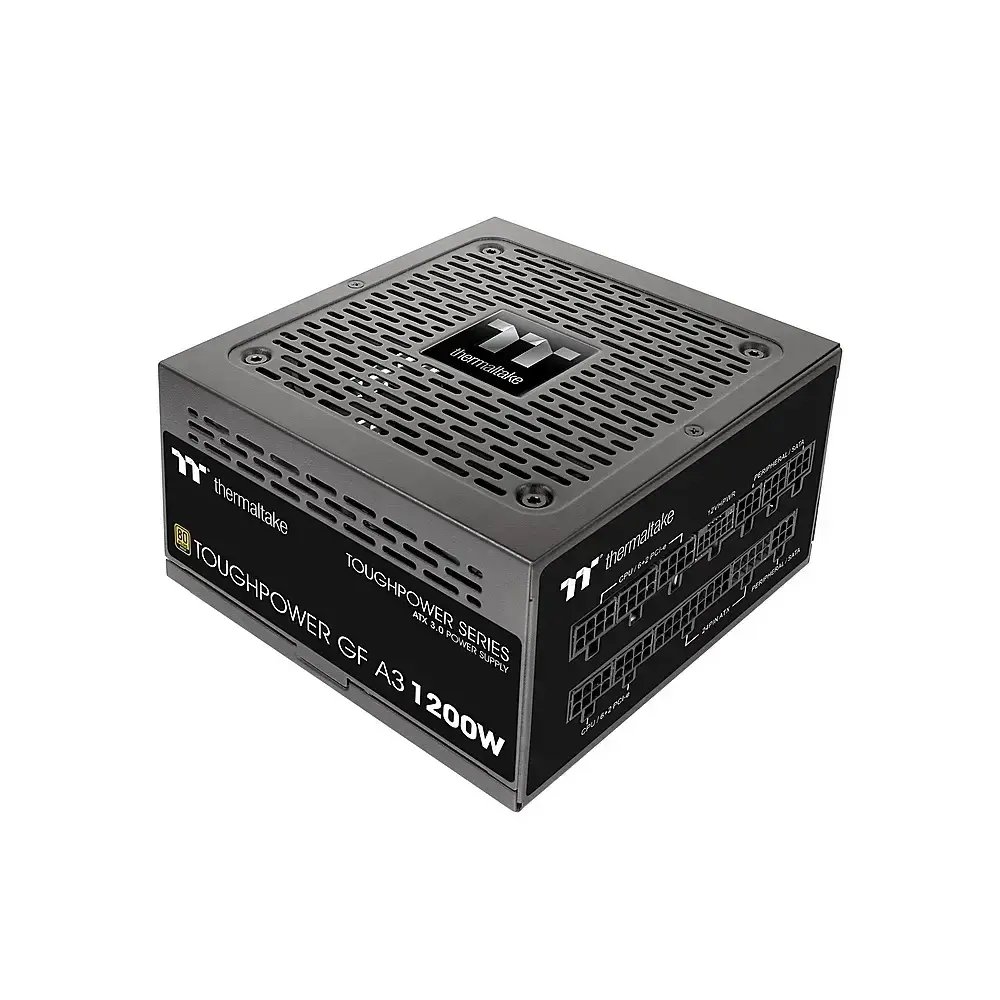 The Thermaltake Toughpower GF A3 1200W is a high-performance 80 PLUS Gold certified power supply designed for efficiency and reliability. It is ATX 3.0 compliant, supporting up to 200% power excursion for peak stability. Featuring PCIe Gen 5.0 readiness, it includes a 16-pin (12VHPWR) connector capable of delivering up to 600W for next-gen GPUs. Its fully modular design ensures clean cable management, while 100% high-quality Japanese capacitors enhance durability. The Smart Zero Fan with a fluid dynamic bearing remains off under low loads for silent operation. Compact at 140mm depth, it fits various PC cases effortlessly. With comprehensive protections like OCP, OVP, UVP, OPP, SCP, and OTP, this power supply ensures safety and long-term reliability for demanding PC builds