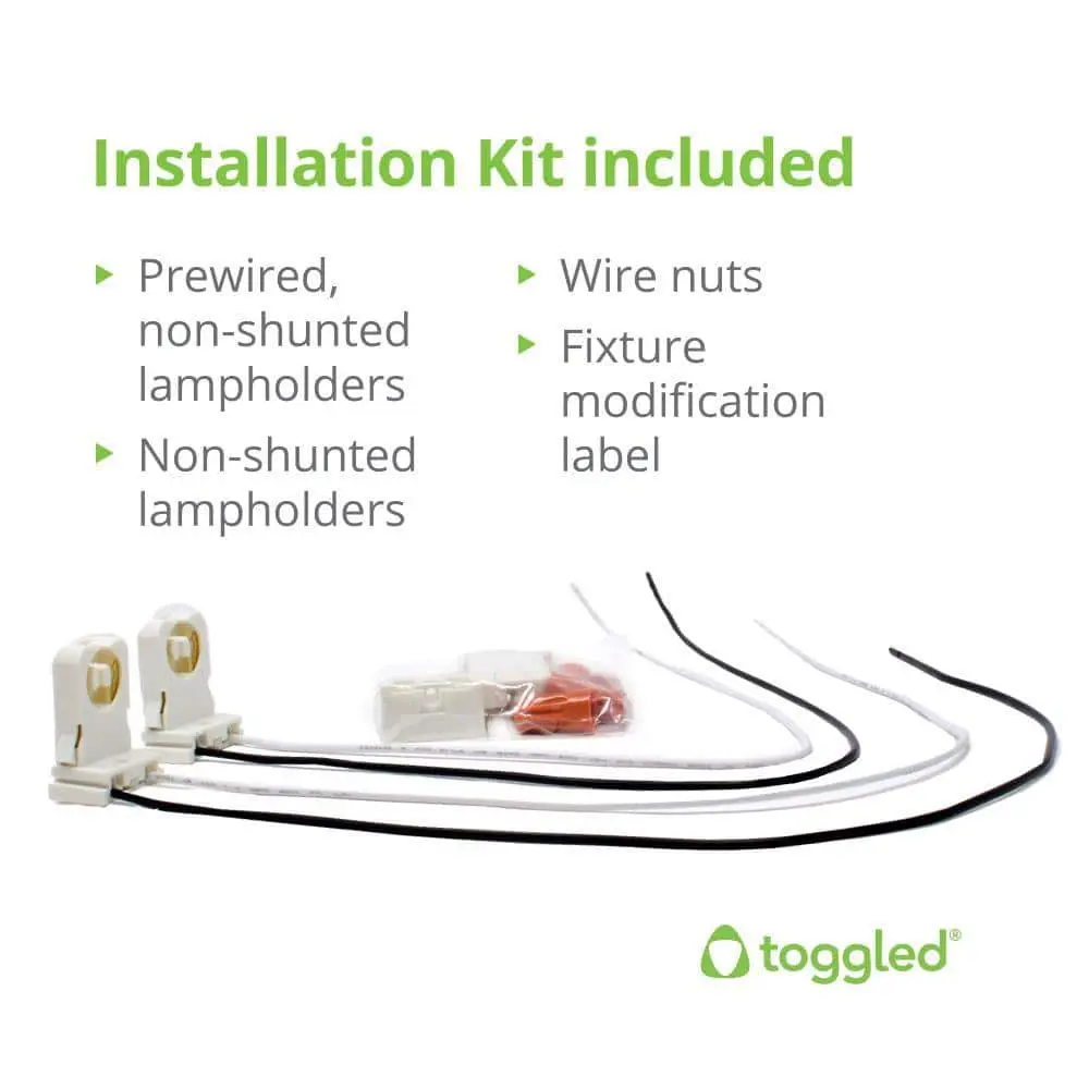 The Toggled direct-wire/Type B LED tubes (2-pack; 6500K/Daylight Deluxe) are an energy-efficient solution designed to replace T8 and T12 fluorescent tubes. These dimmable LED tubes are UL Classified, FCC compliant, and offer 16 Watts of energy usage while delivering 2,000 lumens of brightness. With a long lifespan of 50,000 hours , they are a reliable option for enhancing your facility's lighting. By eliminating ballast systems, these LED tubes help reduce energy costs, improve light quality, and are mercury-free. Installation requires rewiring around ballast systems to non-shunted lamp holders, and it typically takes only about 5 minutes. Removing the ballast not only saves 4-6 Watts but also eliminates the need for future ballast replacements. The installation kit includes pre-wired lamp holders for added convenience.
