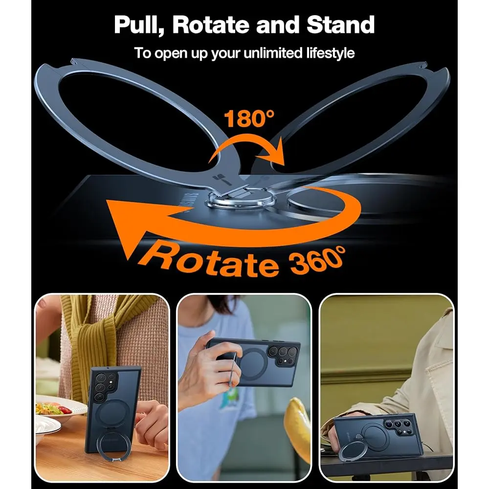 The TORRAS 360° Spin Magnetic Stand Case for Samsung Galaxy S24 Ultra combines sleek design, military-grade protection, and unmatched versatility. Engineered for compatibility with MagSafe accessories, this slim and durable case features a 360° rotating kickstand and ring holder, providing a hands-free experience for media viewing or video calls.