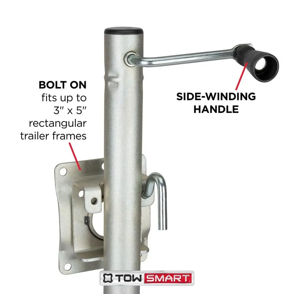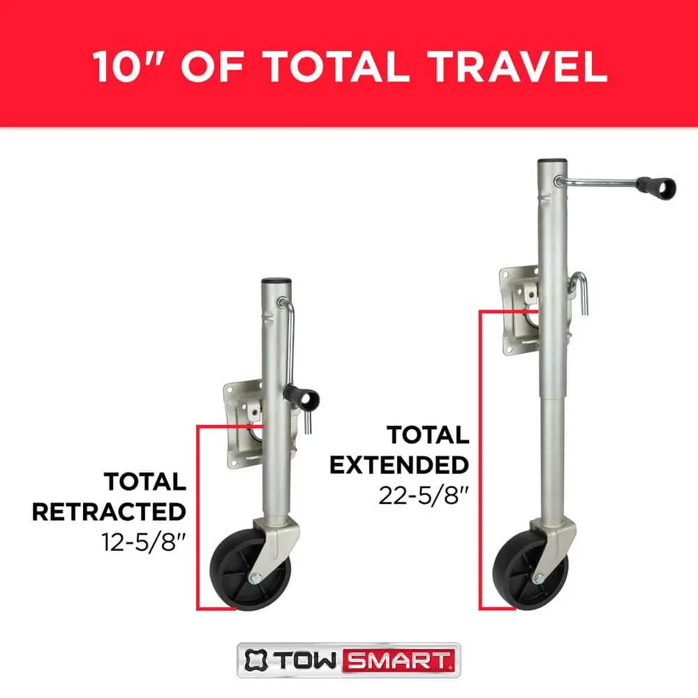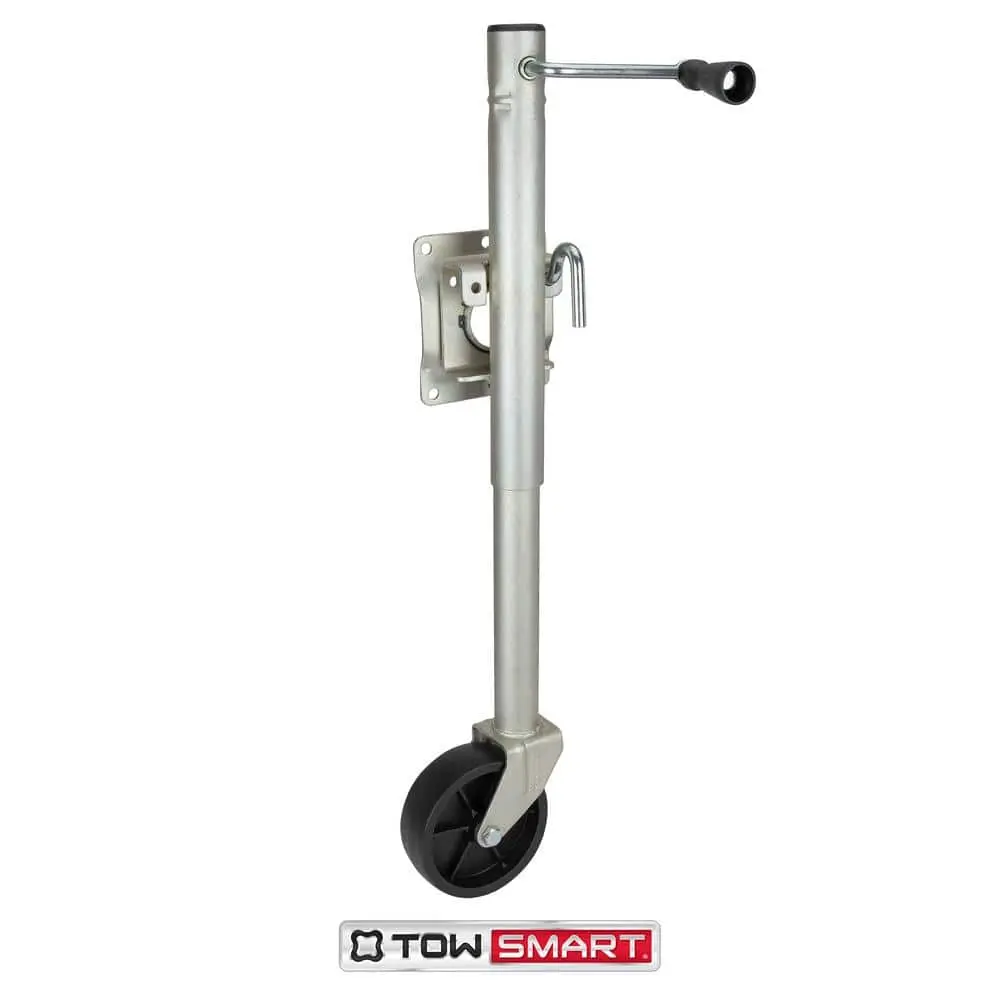 The TowSmart Swivel Swing-Down Trailer Jack is designed with a corrosion-resistant zinc-plated finish, making it ideal for marine and other harsh environments. It securely locks into raised and lowered positions using a spring-loaded locking arm, ensuring reliable support. The jack also features a durable 6-inch heavy-duty molded wheel and comes with all necessary mounting hardware for easy installation.