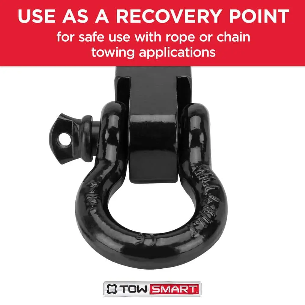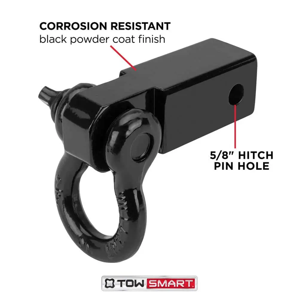 The TowSmart Mount Tow Ring is a versatile and durable solution for various towing needs. Constructed from strong steel with a corrosion-resistant black powder-coat finish, this 7-1/2 in. steel mount with a shackle fits into a 2 in. receiver hitch for enhanced strength.
