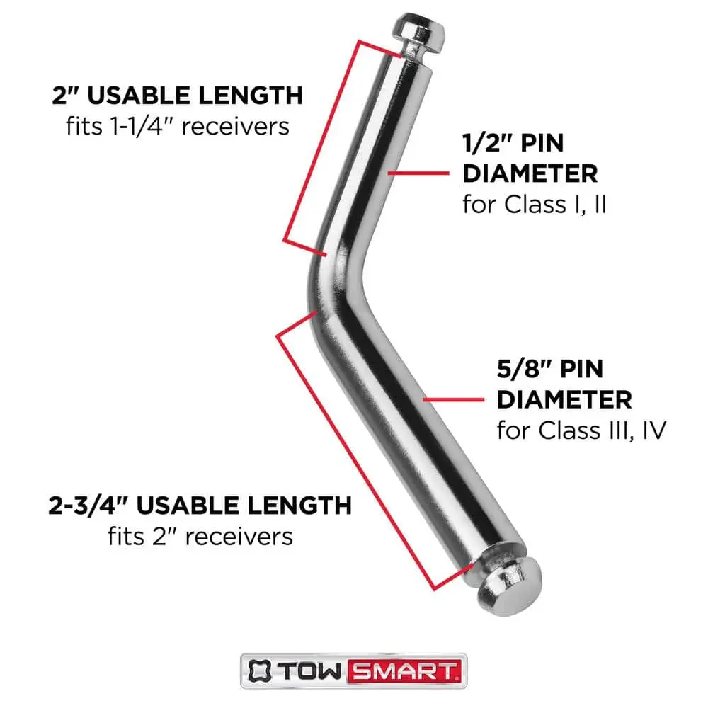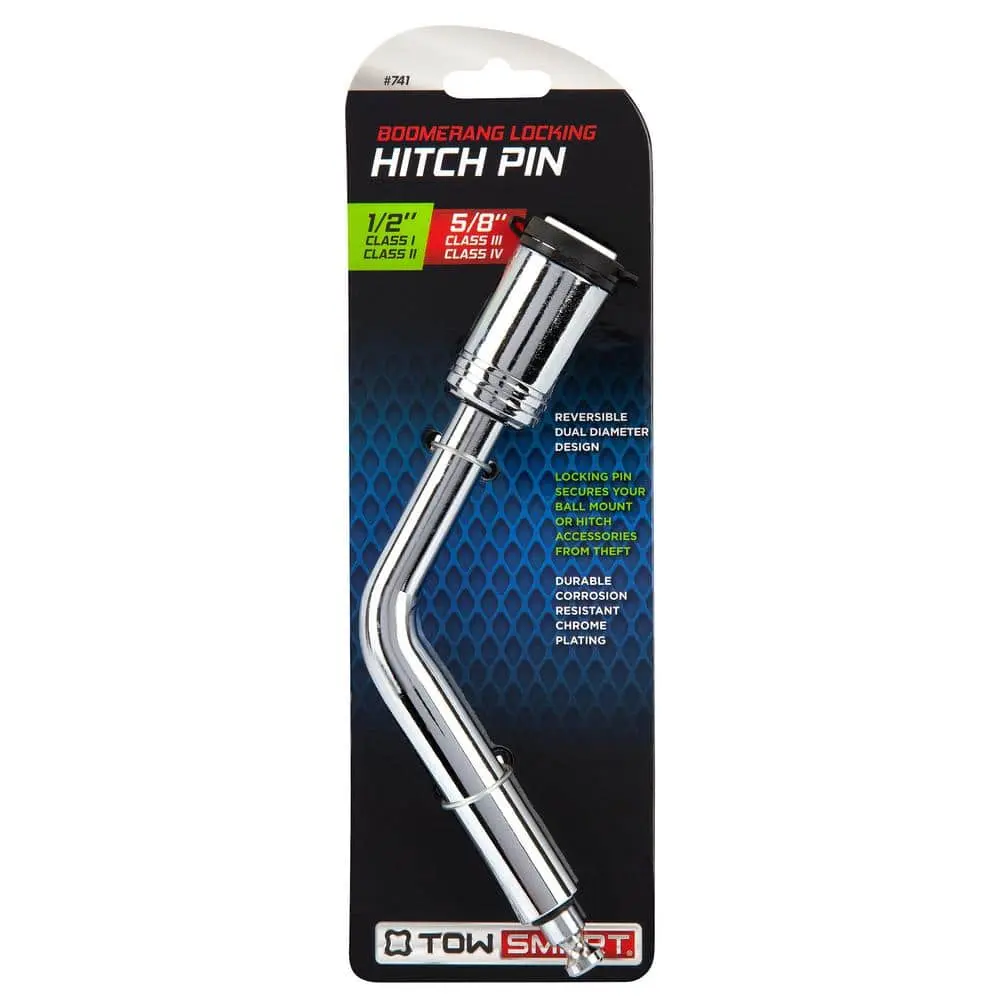The TowSmart Boomerang Hitch Pin offers reliable security for boats, campers, trailers, and other valuable assets by preventing theft. This innovative hitch pin secures ball mounts or hitch accessories to the receiver hitch. Its patented reversible design accommodates both 1/2 in. and 5/8 in. receivers for versatile use. Made from corrosion-resistant materials with a durable chrome-plated finish, it withstands harsh weather conditions. A weather-resistant dust cap shields the locking mechanism from dirt and moisture. Includes two keys for added convenience. Not recommended for long-term use on vehicles.
