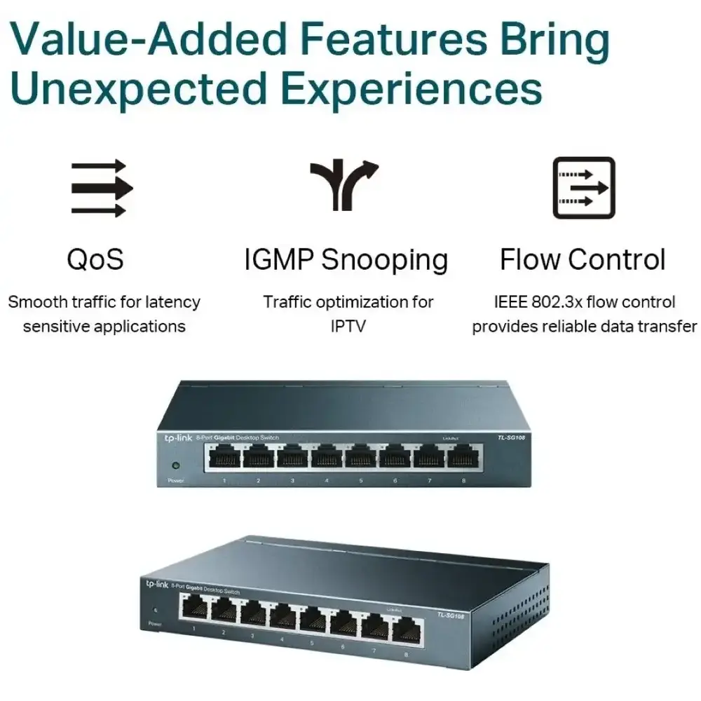 Boost the reliability and efficiency of your network with the TL-SG608 8-Port Gigabit Desktop Switch. Designed to expand your connectivity, this switch features 8x non-blocking gigabit ports, enabling instant data transfers of large, bandwidth-intensive files without interference.