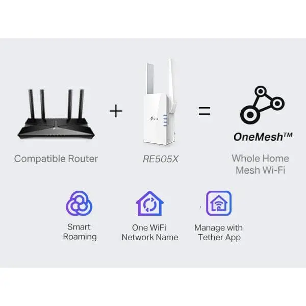 - OneMesh Technology: Pair the RE505X with a TP-Link Mesh router to create a unified network with a single name and password, allowing you to move seamlessly from room to room without switching networks.