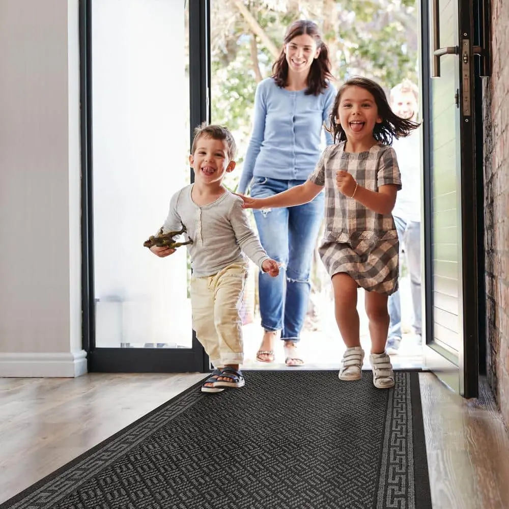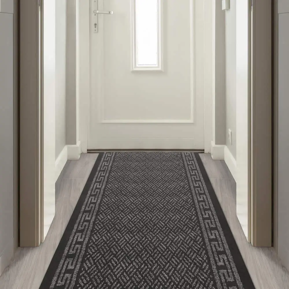 The TrafficMaster Greek Key Charcoal 2 ft. 2 in. x Your Choice Length Roll Runner features a stylish Greek Key pattern in charcoal, adding a modern and sophisticated touch to your space. Made with durable nylon, this runner is built to withstand high foot traffic while maintaining its look. The non-slip backing ensures it stays securely in place, making it ideal for hallways, entryways, or kitchens. It’s easy to maintain with simple vacuuming or spot cleaning, offering both durability and style for your home