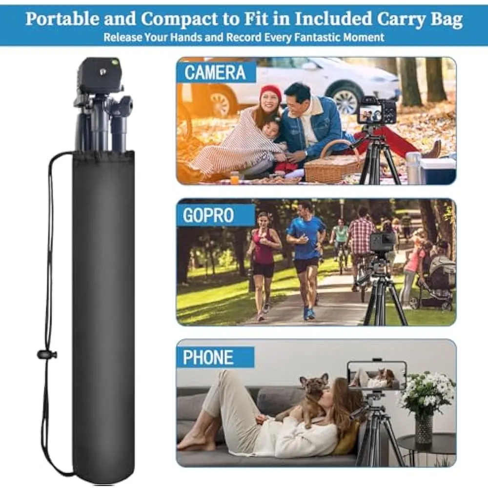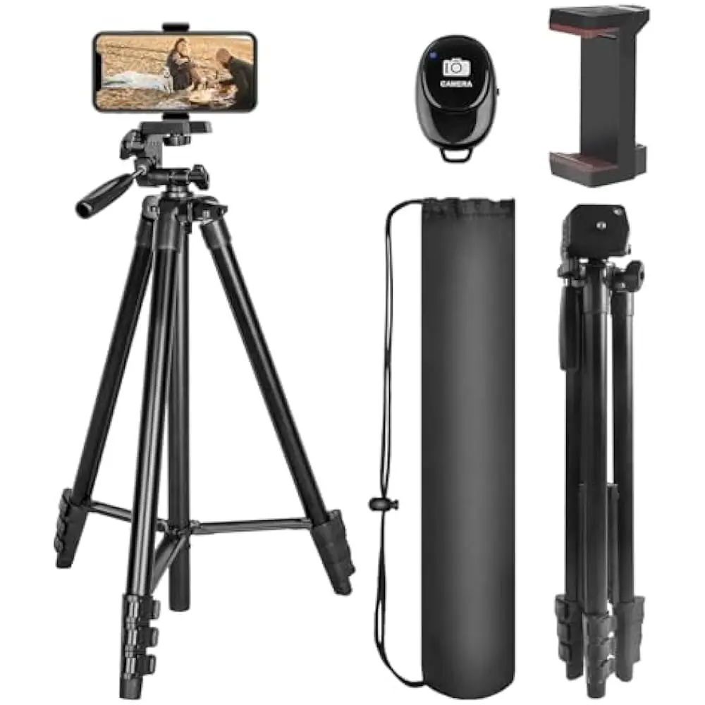 The UEGOGO 62" Phone Tripod is a versatile and lightweight solution for capturing photos, videos, and live streams. With a maximum height of 142 cm (62"), it is compatible with a variety of devices including iPhones (15/14/13/12/11 series), GoPro, DSLR cameras, and more. It supports a load capacity of up to 4.5 lbs, making it suitable for various setups. The tripod features a pan head for smooth adjustments, and comes with a remote control for hands-free operation. Its portable design, made from aluminum and plastic, ensures durability and easy transport. Ideal for vlogging, selfies, and video recording.