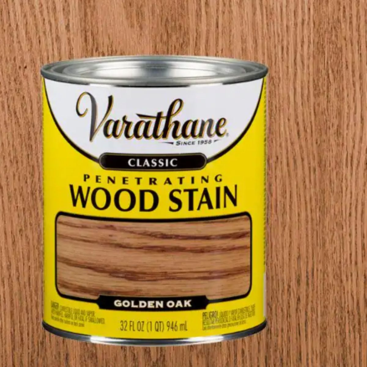 Varathane 1 qt. Golden Oak Classic Wood Interior Stain is crafted to enrich the natural grain of interior wood surfaces like furniture, cabinets, doors, and trim, imparting a rich, natural color that highlights the wood's inherent beauty. It applies effortlessly using a high-quality synthetic brush, lint-free cloth, or foam applicator, ensuring smooth and even coverage. This stain allows for easy color customization or the option to achieve a darker hue by applying additional coats. Its semi-transparent formula preserves the wood's natural grain appearance while deeply penetrating to provide robust, long-lasting protection. Each quart covers up to 150 sq. ft., and it can be recoated in just 2 hours to intensify the color depth. Available in a timeless array of colors, it facilitates seamless matching with previously stained projects. Most surfaces or projects typically require two coats, with the flexibility to apply more coats for a personalized finish. The final coat dries within 4 hours, allowing for subsequent application of polyurethane to enhance protection. For best results, wait 8 hours before applying oil-based polyurethane and 24 hours before water-based polyurethane.