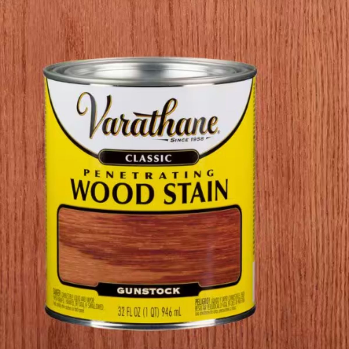 Varathane 1 qt. Gunstock Classic Wood Interior Stain is designed to enrich the natural grain of interior wood surfaces such as furniture, cabinets, doors, and trim, imparting a rich and natural color that accentuates the wood's unique characteristics. This stain applies smoothly and easily with a high-quality synthetic brush, lint-free cloth, or foam applicator, offering versatility in application methods. It allows for easy customization of color intensity or achieving a darker shade by applying additional coats. The semi-transparent formula ensures that the wood grain remains visible, enhancing its natural beauty while deeply penetrating to provide durable, long-lasting protection. Each quart covers up to 150 sq. ft., and it can be recoated in just 2 hours to build up the color depth effectively. Available in a timeless assortment of colors, it facilitates seamless matching with previously stained wood projects. Most surfaces or projects typically require two coats for optimal results, with the option to apply extra coats to further personalize the finish. The final coat dries within 4 hours, enabling the application of polyurethane for additional protection. For best results, allow 8 hours before applying oil-based polyurethane and 24 hours before water-based polyurethane.