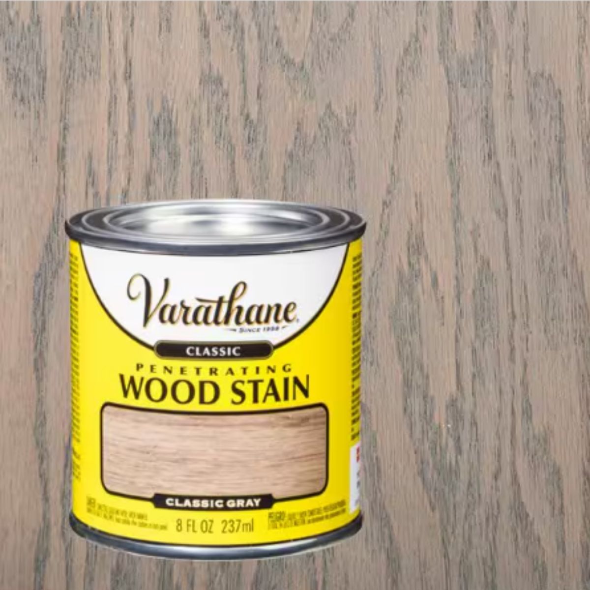 Varathane 8 oz. Gray Classic Wood Interior Stain enriches wood grain with a rich, natural color that enhances the beauty of furniture, cabinets, doors, trim, and more. It applies smoothly with a high-quality synthetic brush, lint-free cloth, or foam applicator, allowing for customizable color intensity with additional coats. This semi-transparent formula preserves the natural wood grain while providing deep-penetrating, long-lasting protection. Each can covers up to 37 sq. ft., and recoating can be done in just 2 hours to build color depth. Available in a timeless assortment of colors, it seamlessly matches previous stain projects. Most surfaces typically require 2 coats, with the option to apply additional coats for a personalized finish. The final coat dries within 4 hours. For enhanced durability, apply polyurethane after waiting 8 hours (for oil-based poly) or 24 hours (for water-based poly).