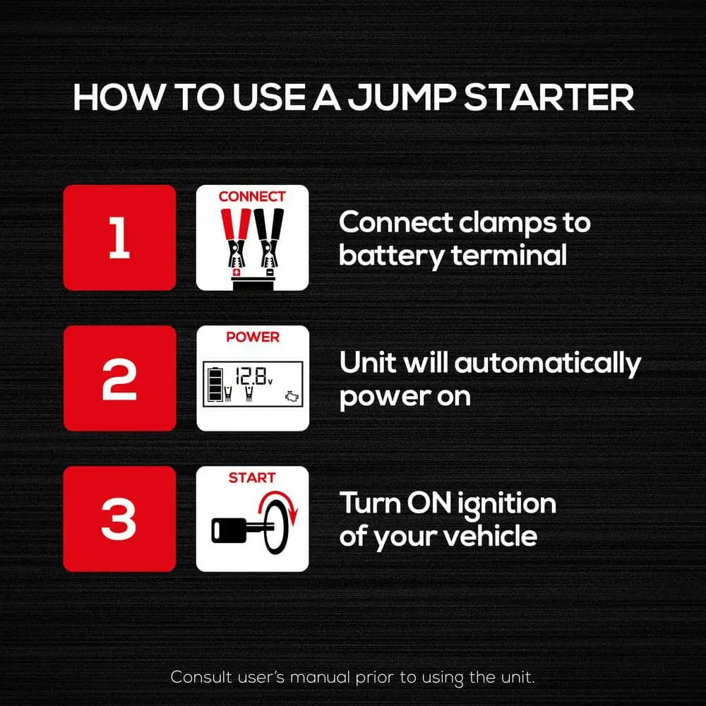 • 1600 peak amp jump starter designed for cars, trucks, and SUVs up to V8