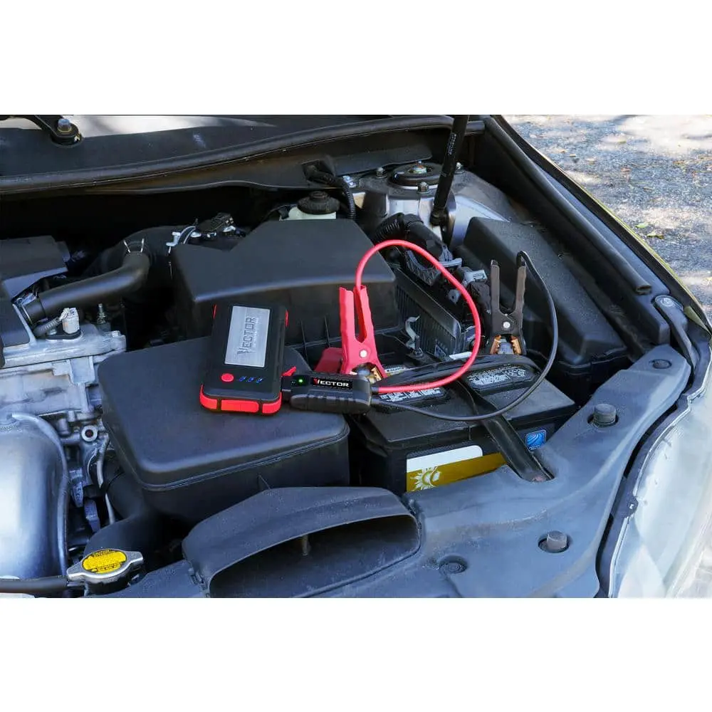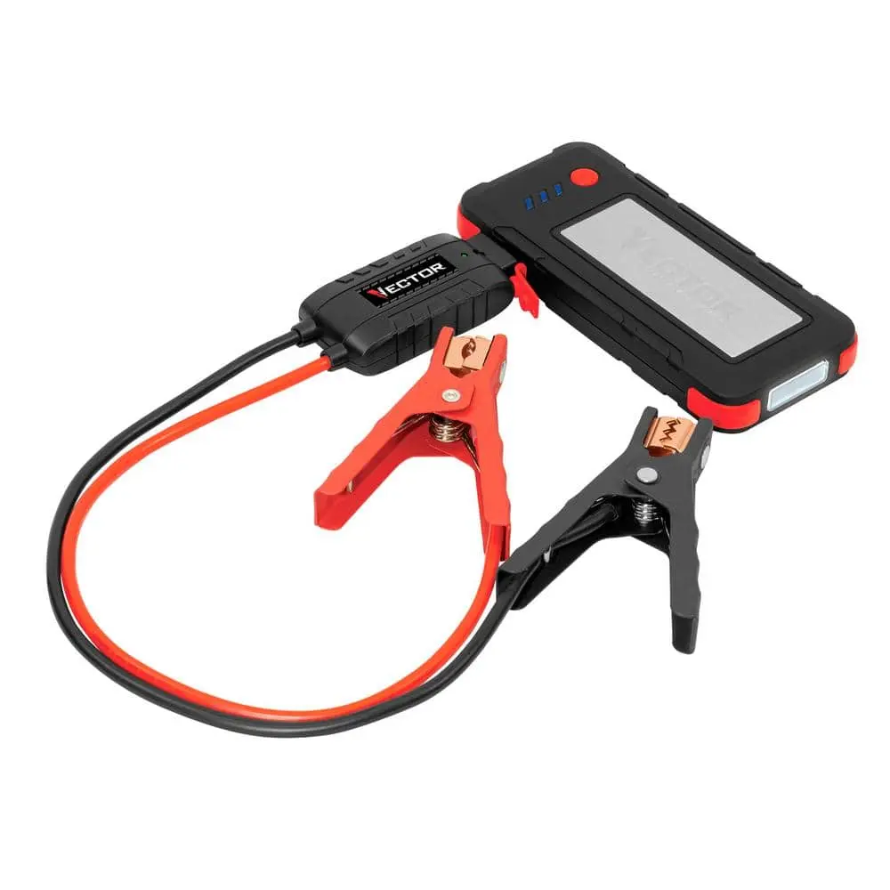 The VECTOR 1600 Peak Amp Jump Starter, SS16LV, is a compact, portable jump starter and USB power bank. It provides 1600 peak amps of starting power to quickly jump-start cars and trucks with up to 8 cylinders. The jump starter comes with powder-coated metal clamps and features an Engine Start Smart Controller for reverse polarity protection, ensuring correct cable connections. It also includes USB-A and USB-C ports (3.1 amp/15 watt) to charge devices such as laptops, cell phones, tablets, and gaming devices. A bright LED light assists with repairs after dark. With over 25 years of delivering quality products. Performance may vary based on the age of the product, battery level, and other external factors.