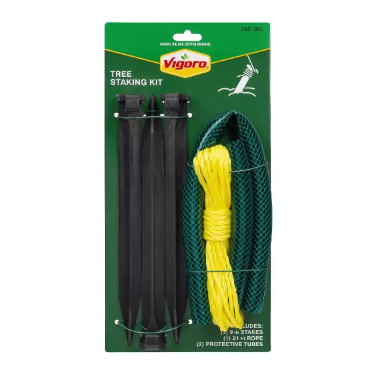 Support, train, and anchor young trees effortlessly with the Vigoro Tree Stake Kit! This all-in-one kit includes three 9 in. stakes and 21 ft. of rope, providing easy and weather-resistant support for your garden. A must-have gardening asset for nurturing young trees.