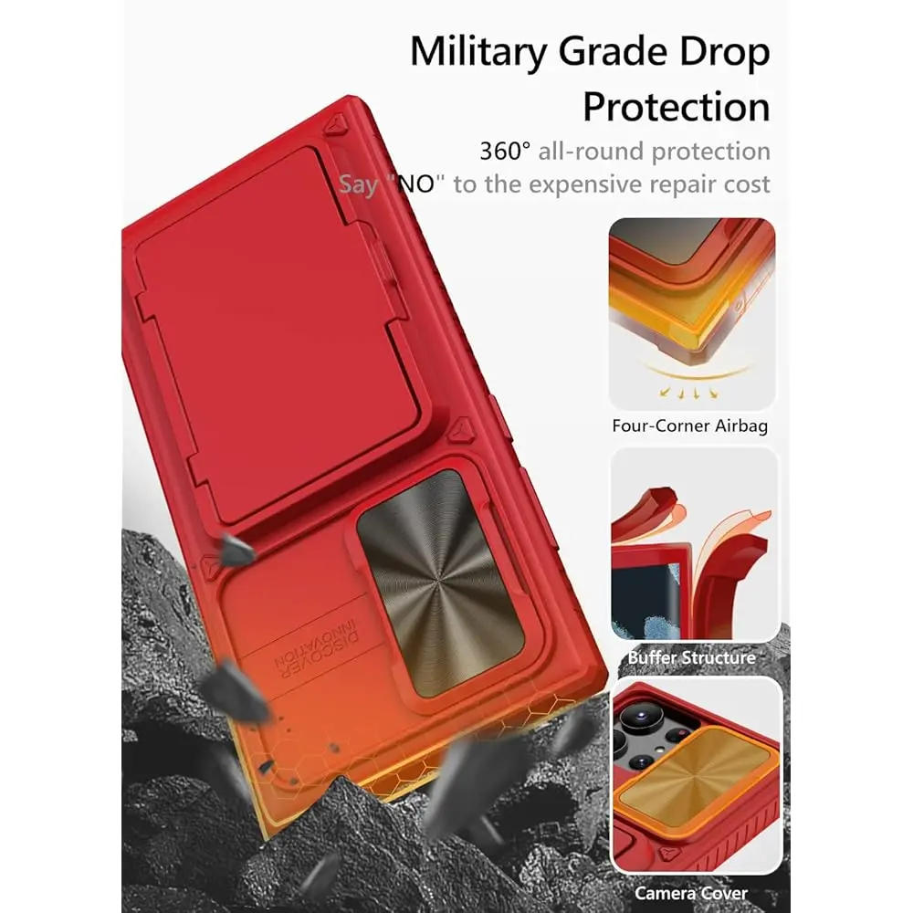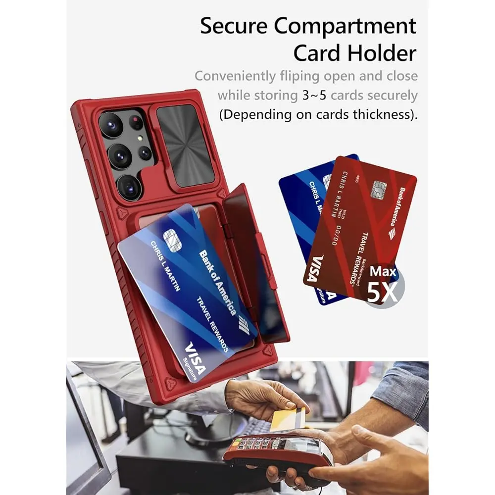 Designed with a built-in card holder, it securely stores up to 4 cards, such as credit cards or IDs, allowing you to travel light without the need for a separate wallet. The case also features a sliding camera protection cover, providing a secure barrier against scratches and damage while maintaining privacy.