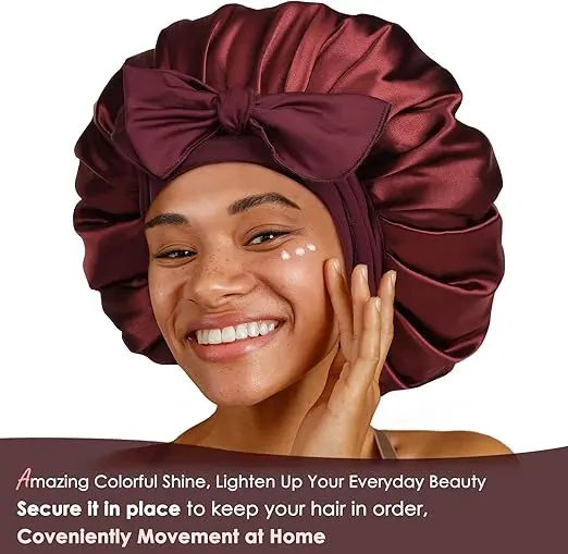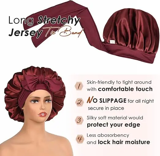 Tired of your bonnet slipping off while you sleep? This non-slip satin bonnet features a long, stretchy band that's soft, elastic, and skin-friendly. Simply wrap it around your head, adjust the tightness, and tie it to keep it secure all night, preventing messy hair and protecting your locks.More than just a bonnet, you can style it in various ways with the 2.8 wide, 58 long band that stretches up to 75. Create a bow on your forehead or sides, make a knot, or simply wrap it at the back.The 2.7 wide band grips wigs well, providing excellent protection while keeping edges neat. Made from breathable, smooth pink satin, it helps retain moisture without feeling tight or leaving imprints.Stylish and versatile, this bonnet can be used for sleeping, housework, makeup, gym, running, yoga, and more, allowing you to express your unique style!