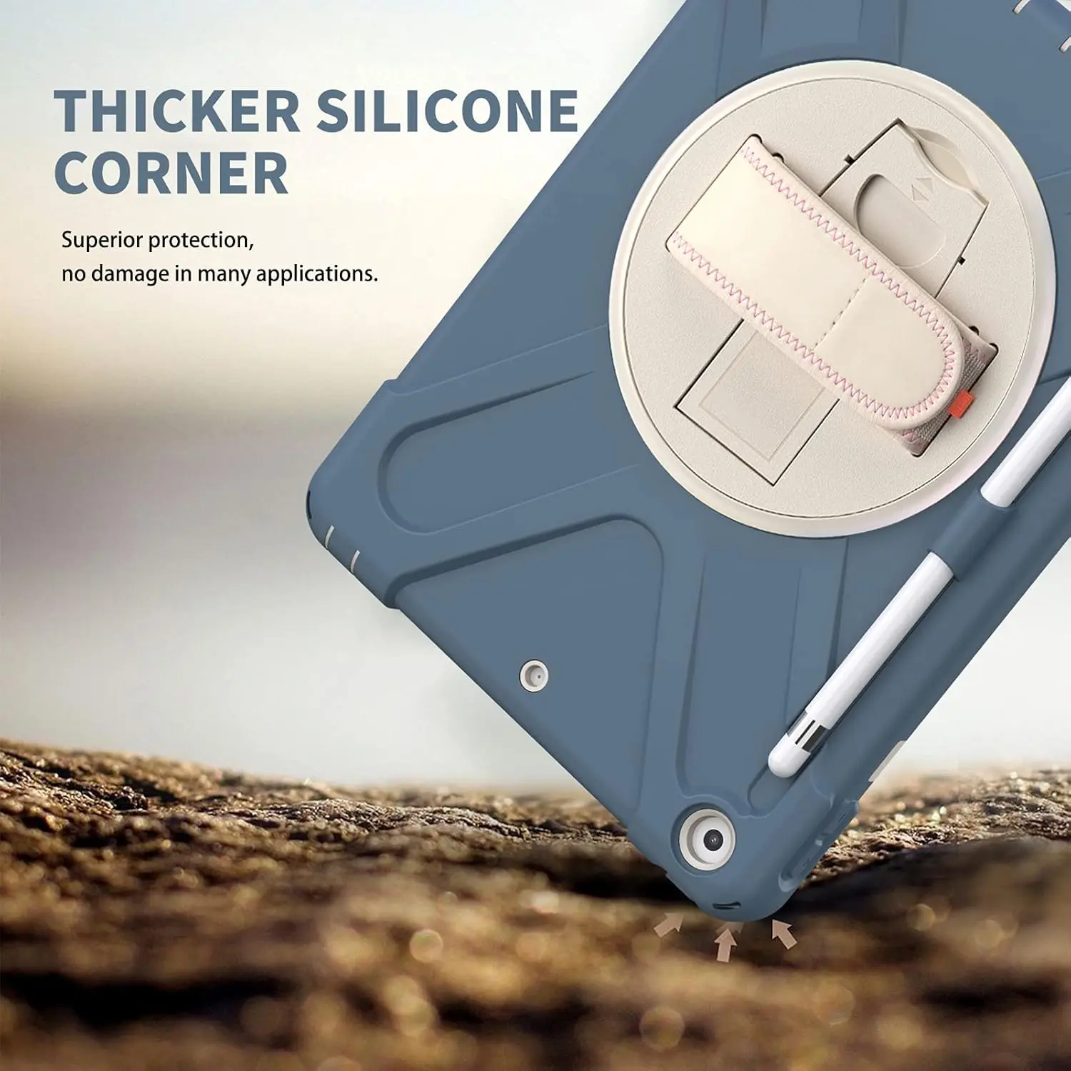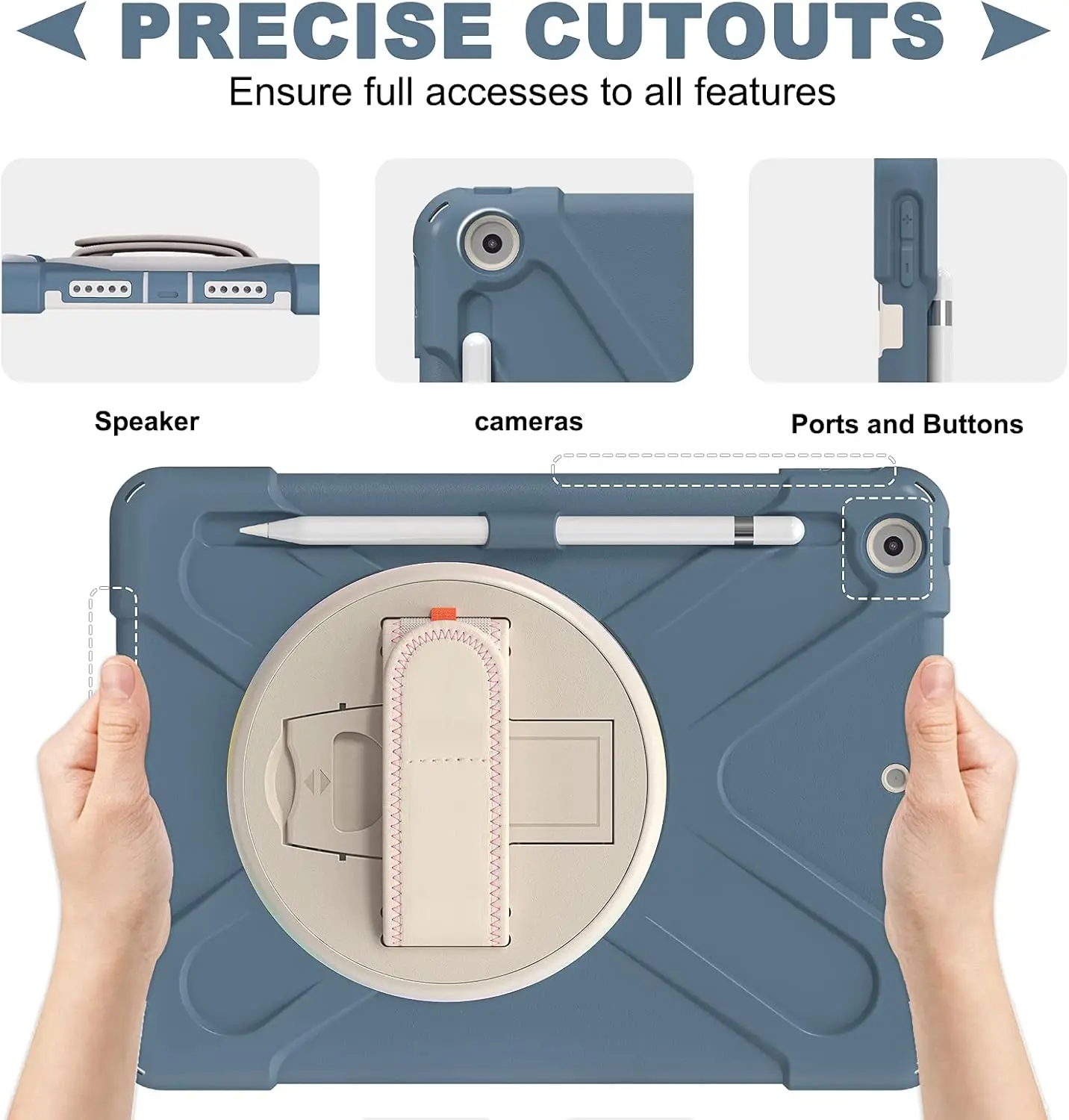 The ZenRich Rugged Shockproof Case offers robust protection and convenience for your iPad 9th, 8th, or 7th Generation (10.2-inch models). Built for durability and functionality, this case features a 360-degree rotating kickstand, a built-in pencil holder, an adjustable hand strap, and a detachable shoulder strap for easy carrying. The 3-layer design with a silicone outer frame and reinforced inner shell ensures maximum protection, making it ideal for kids and adults alike.