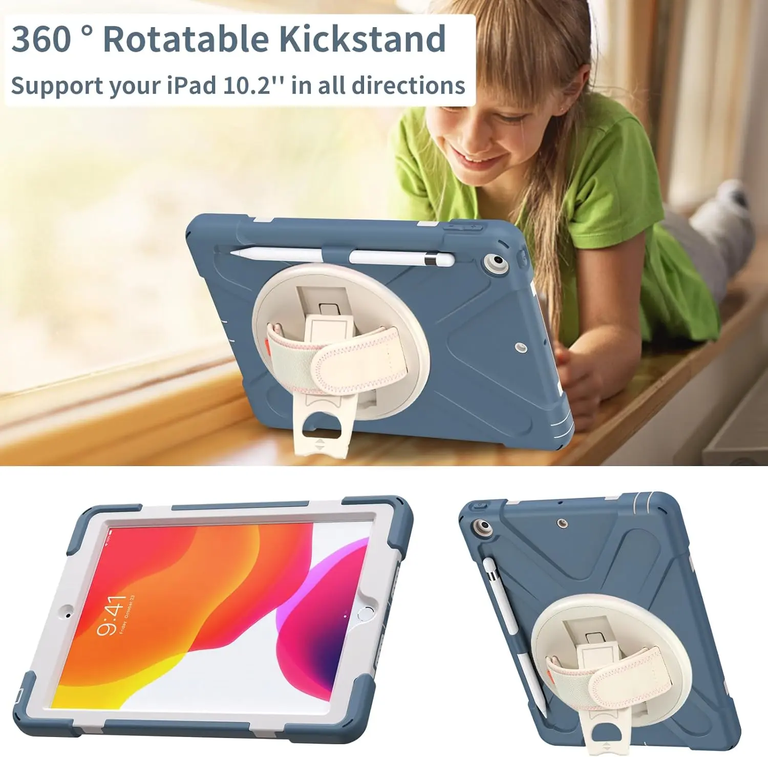 ZenRich Rugged Shockproof Case for iPad 9th/8th/7th Generation 10.2 inch (2021), with Pencil Holder, Rotating Hand Strap, Stand, Shoulder Strap, and Screen Protector (A-Cornfolwer Blue)