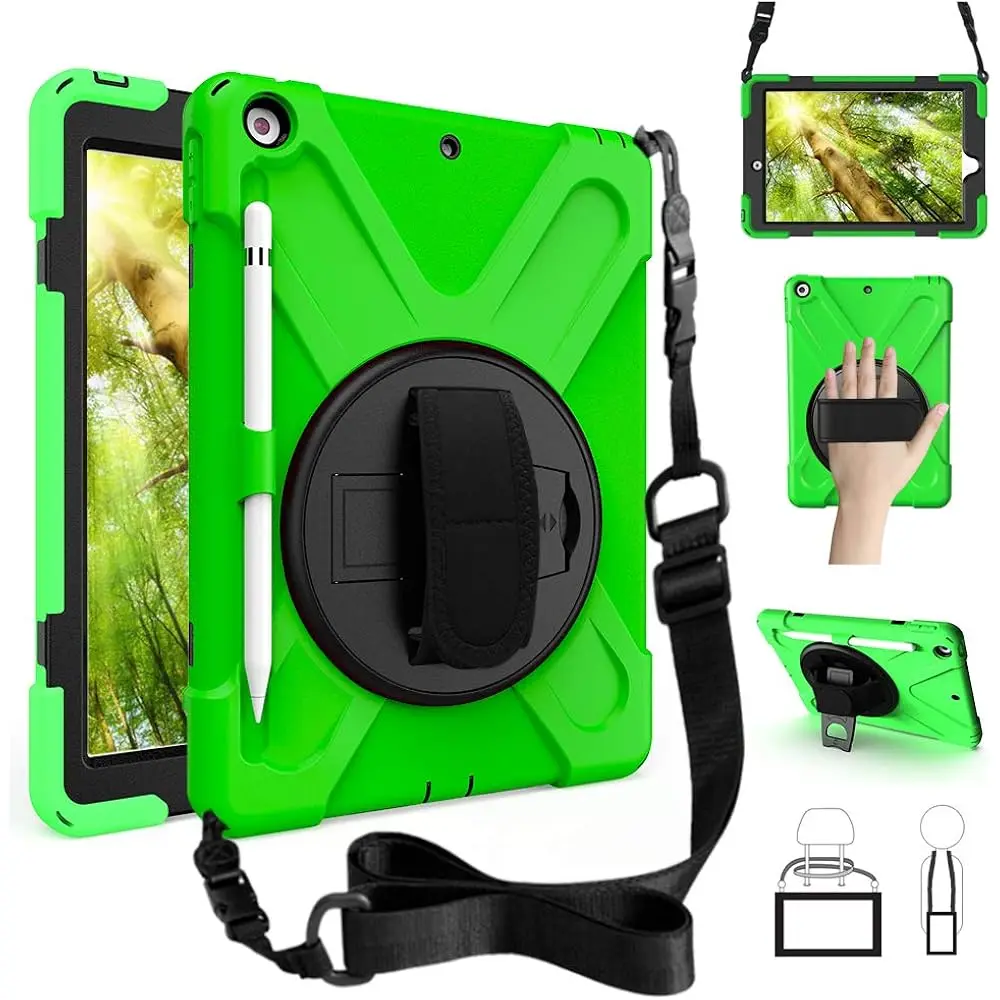 ZenRich Rugged Shockproof Case for iPad 9th/8th/7th Generation 10.2 inch (2021), with Pencil Holder, Rotating Hand Strap, Stand, Shoulder Strap, and Screen Protector (A-Green)