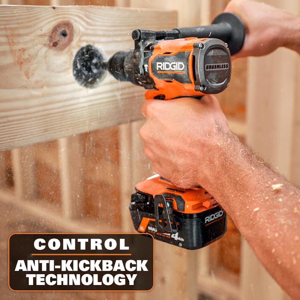 The RIDGID R92082 18V Brushless 2-Tool Combo Kit offers powerful performance with its Brushless 1/2 in. High Torque Hammer Drill and Brushless 4-Mode 1/4 in. Impact Driver. The hammer drill delivers 1,250 in./lbs of torque and features a 2-speed gearbox with a maximum RPM of 2,000, making it suitable for demanding tasks like drilling into wood, metal, and concrete. It includes anti-kickback technology for added safety and faster drilling compared to previous models. The impact driver provides 2,400 in./lbs of torque and offers 40% faster driving with its 4 modes and 3 speeds. This kit comes with a 6.0 Ah MAX Output battery, a 4.0 Ah MAX Output battery, a charger, and a hard case. All tools are compatible with RIDGID's 18V batteries and come with a Lifetime Service Agreement if registered within 90 days of purchase.